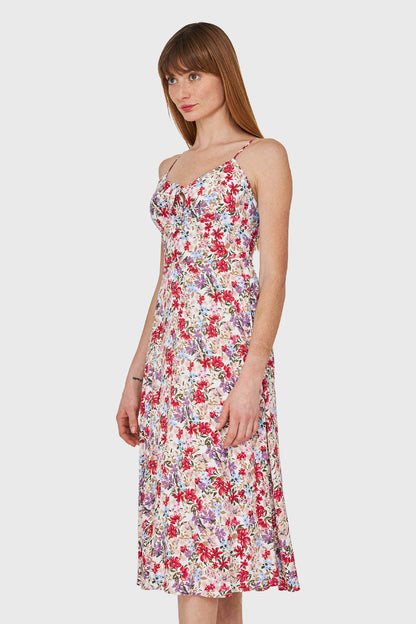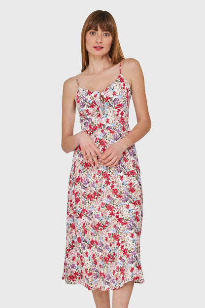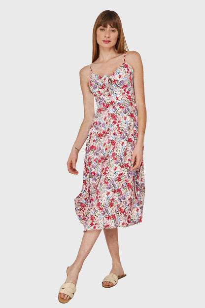 Características: Vestido floral con nudo frontal ajustable. Tirantes ajustables, lazos ajustables en espalda, cierre invisible y espalda elasticada. Posee forro.