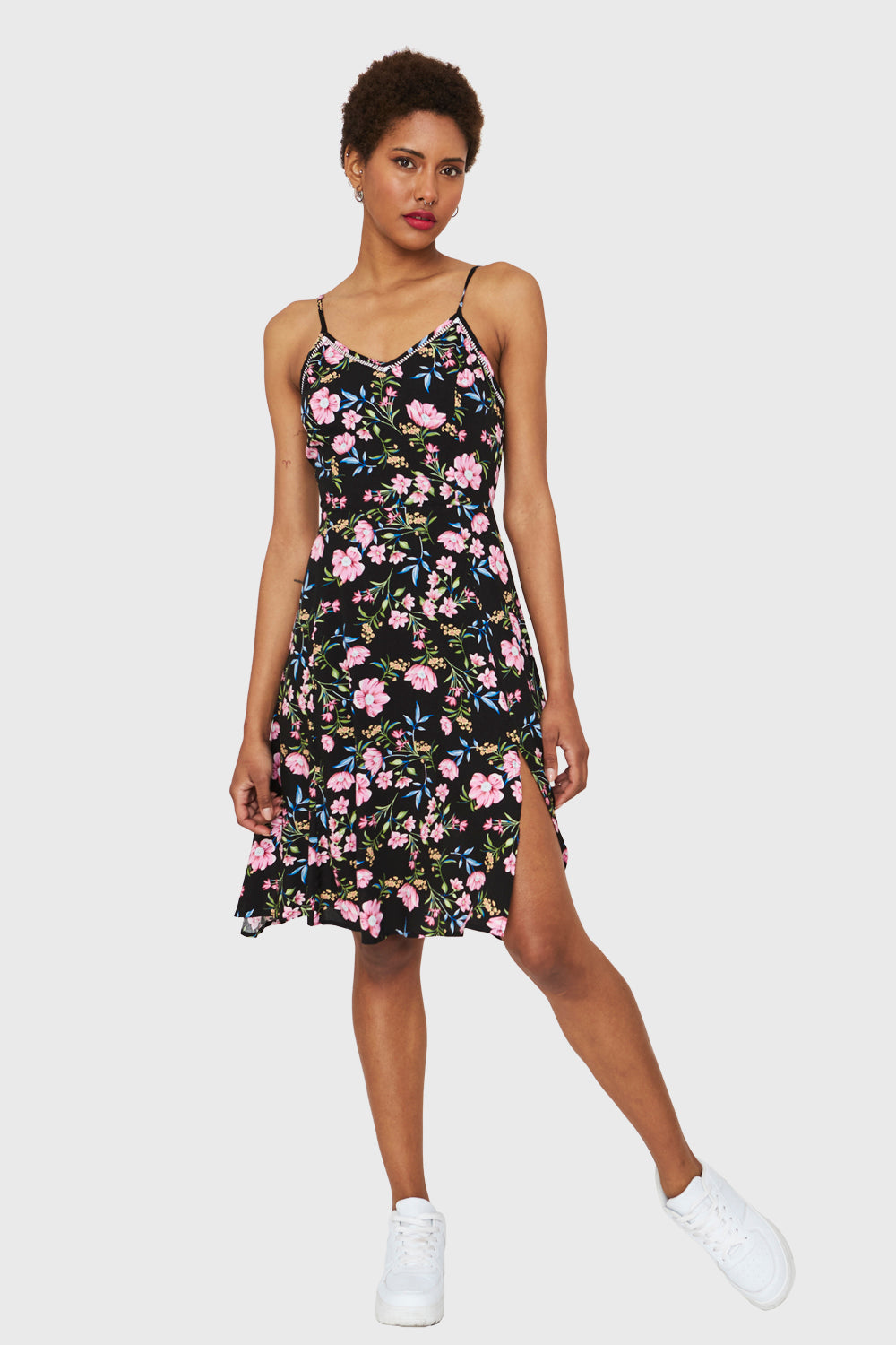Características: Vestido floral con tajo lateral. Escote V, tirante pabilo ajustable, con forro, y cierre invisible en espalda.