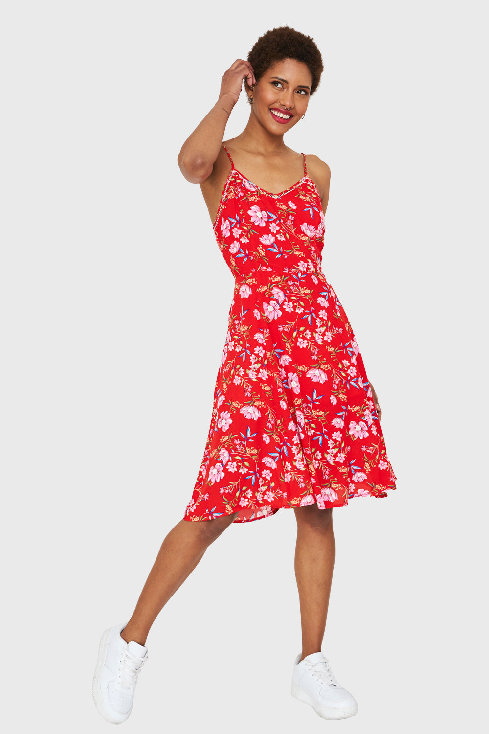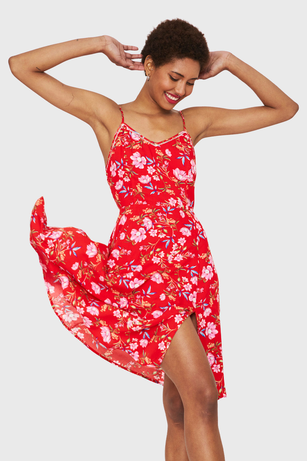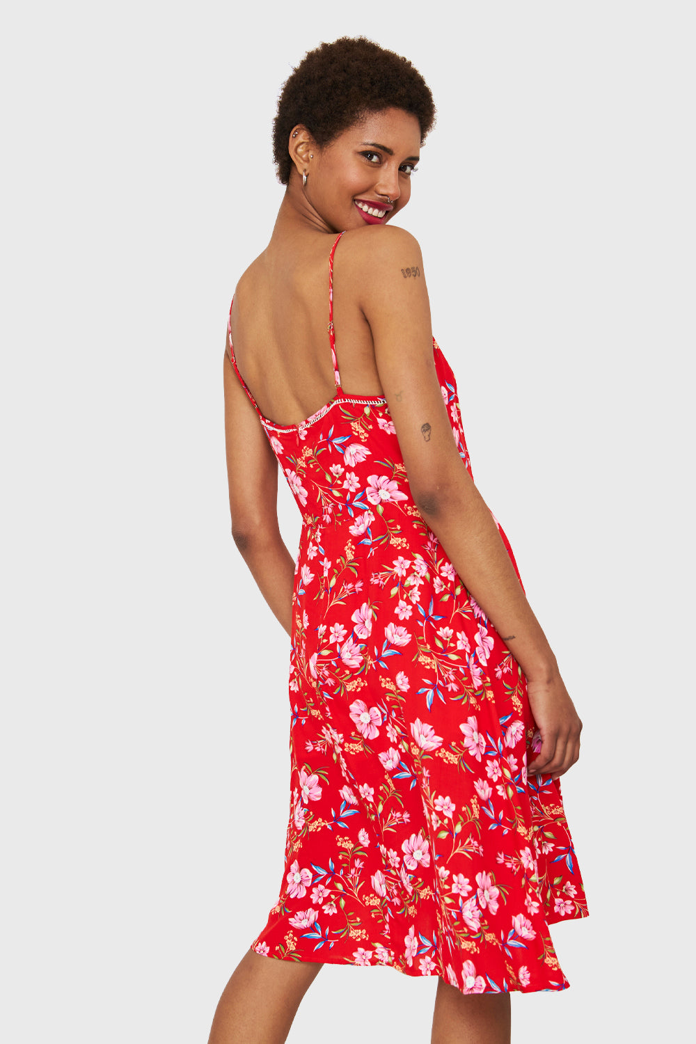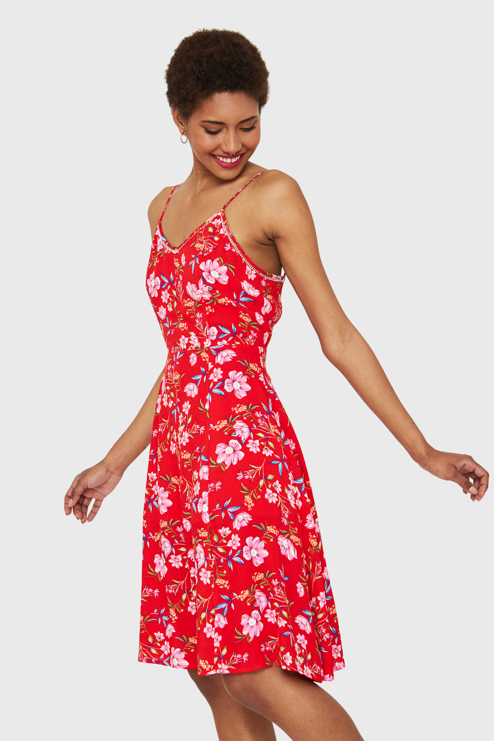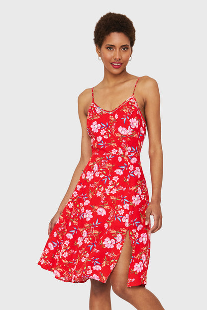 Características: Vestido floral con tajo lateral. Escote V, tirante pabilo ajustable, con forro, y cierre invisible en espalda.