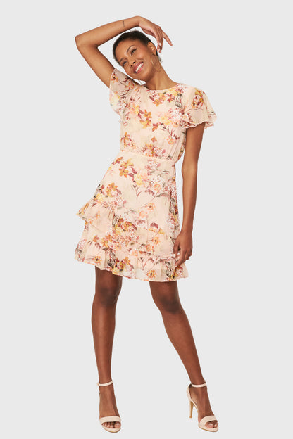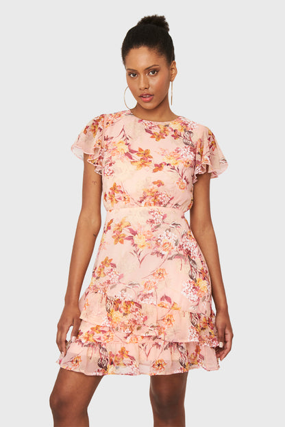 Características: VVestido corto con volantes en faldón. Print floral. Manga corta tipo vuelos y escote bote. Cierre invisible en espalda y elástico en parte trasera de la cintura. Posee forro.
