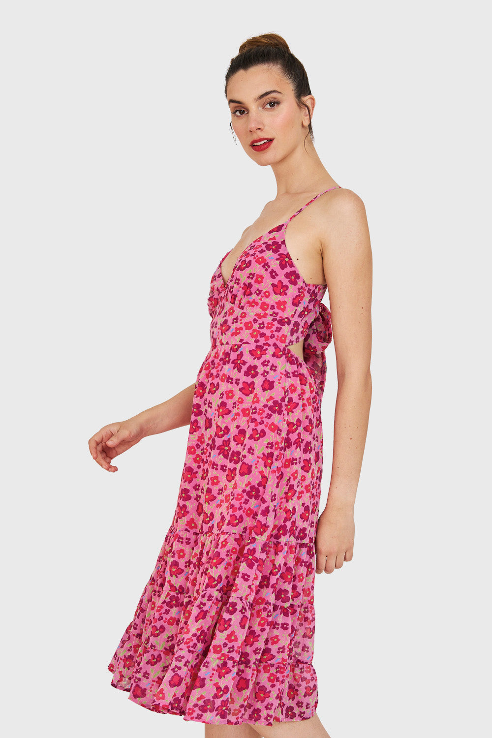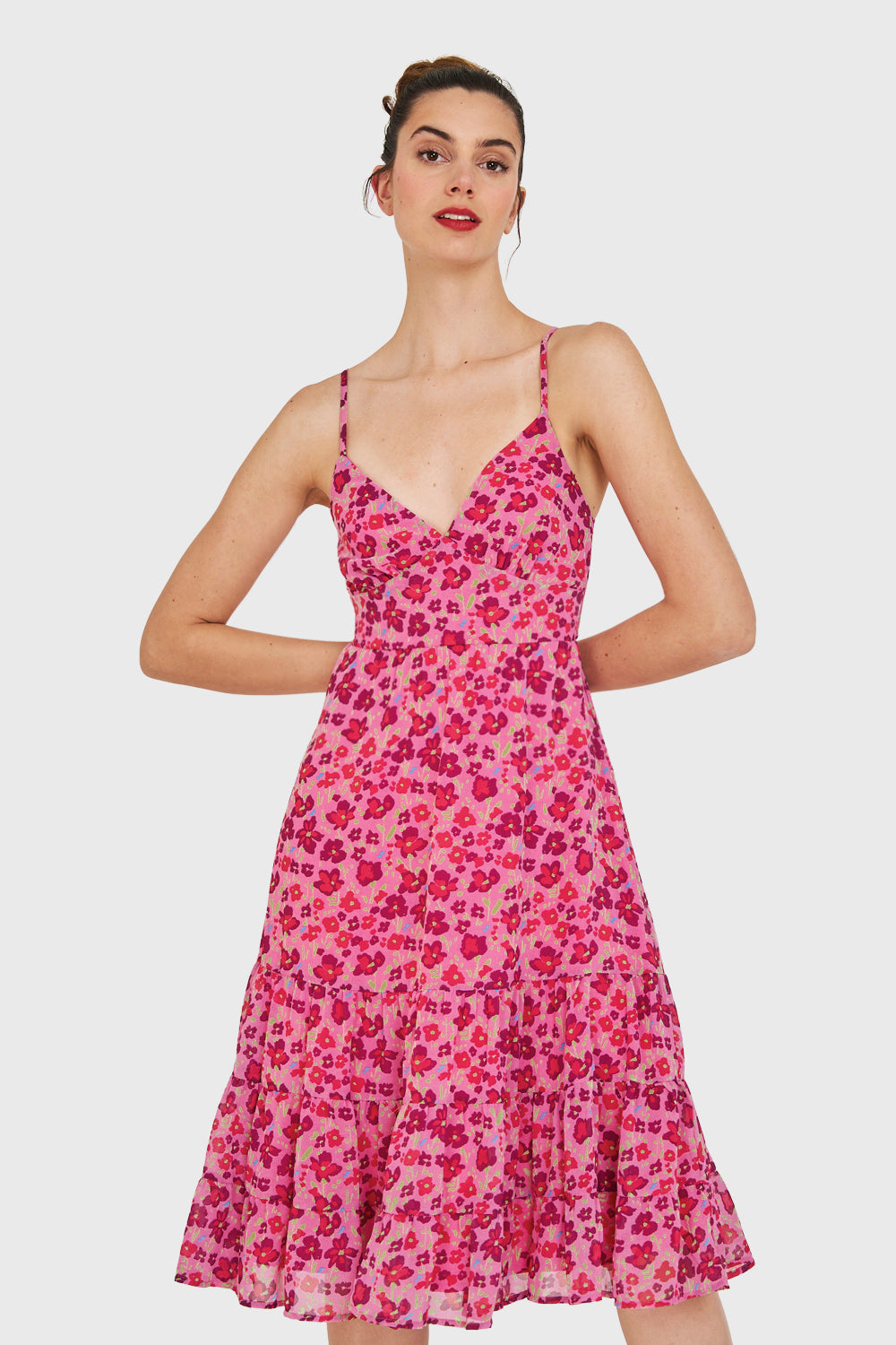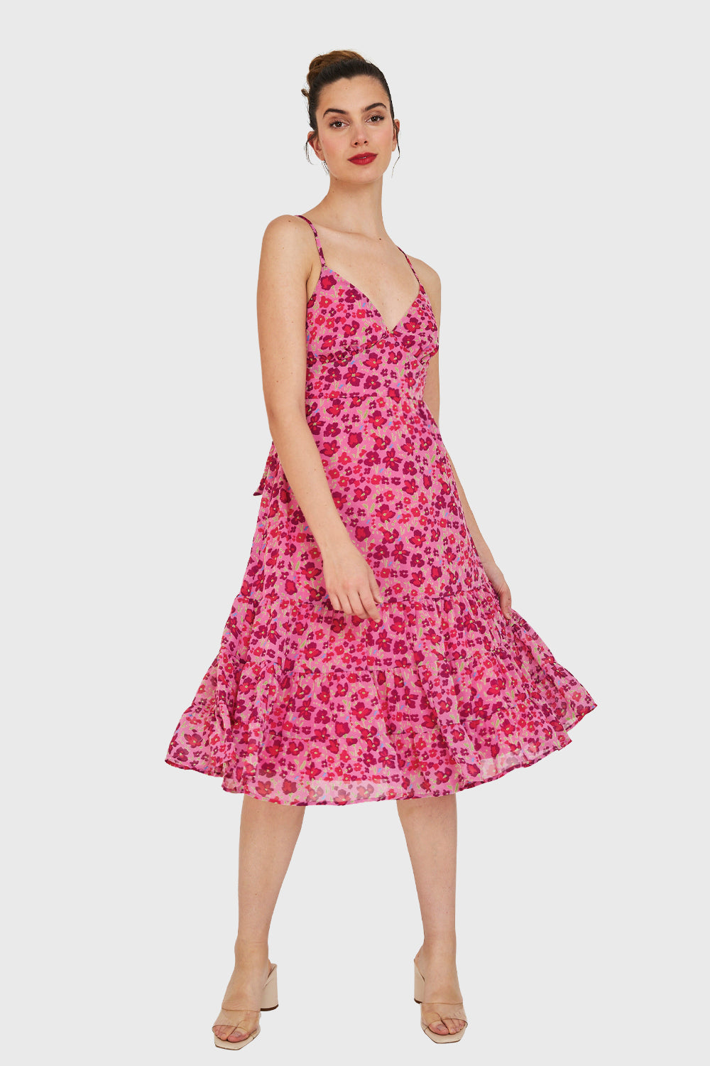 Características: Vestido midi estampado floral escote V con tirantes ajustables. Lazo en espalda, elastico y cierre invisible. Forrado.
