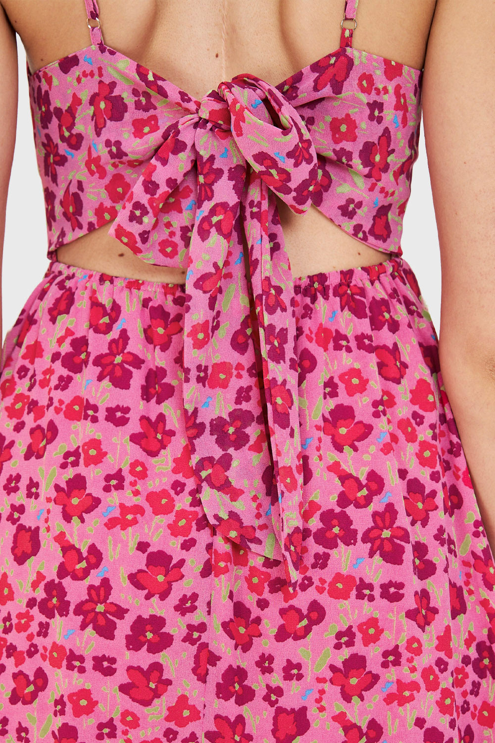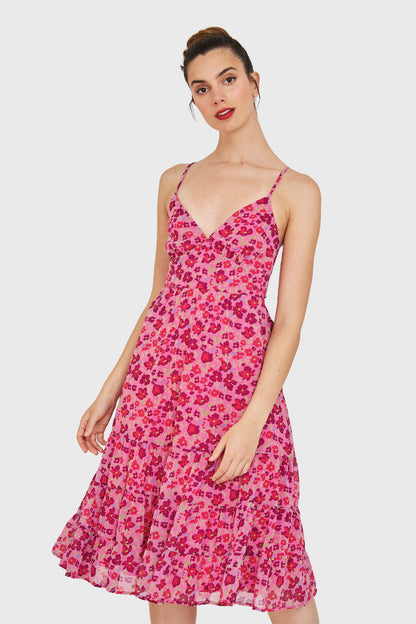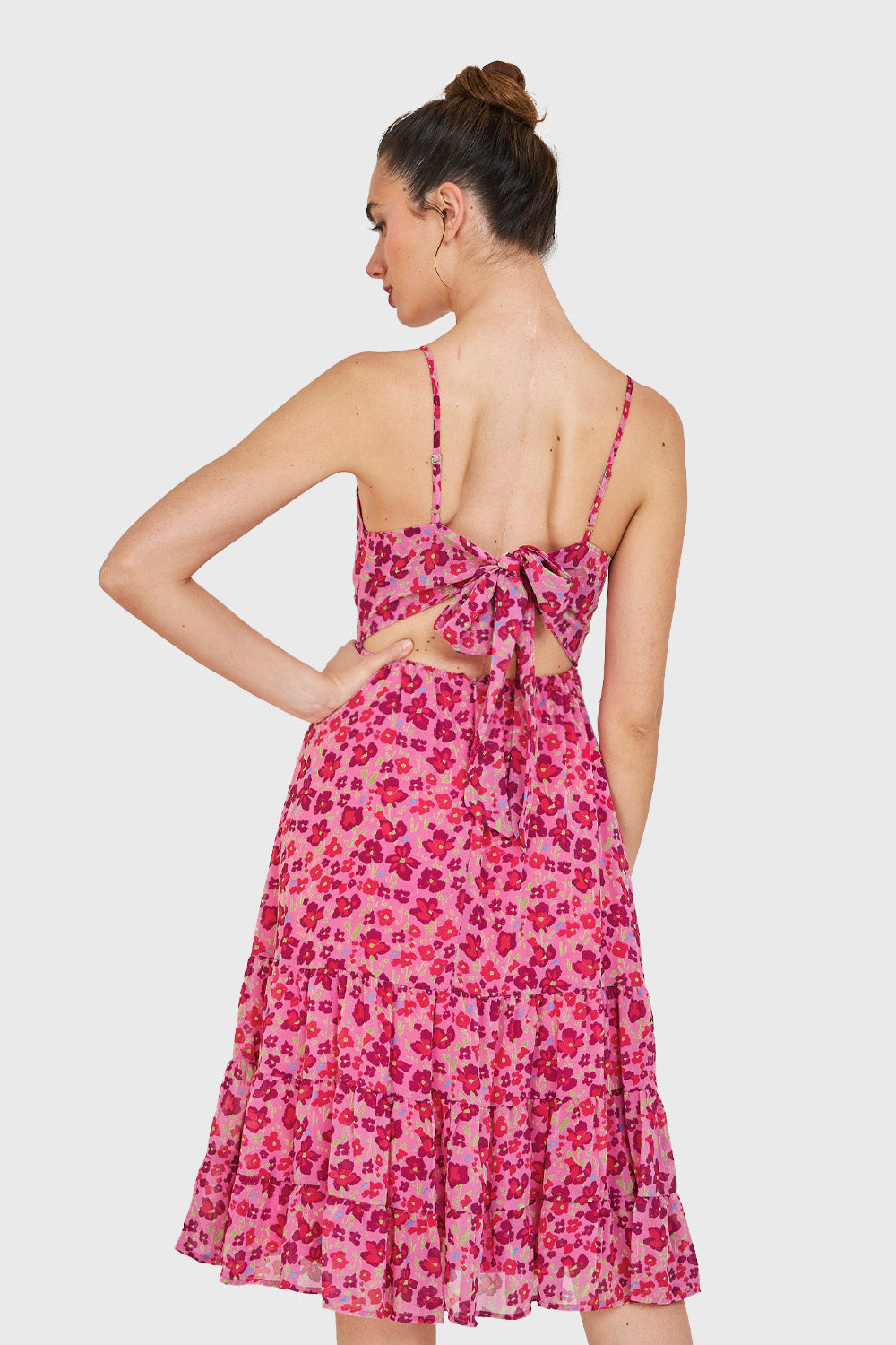 Características: Vestido midi estampado floral escote V con tirantes ajustables. Lazo en espalda, elastico y cierre invisible. Forrado.