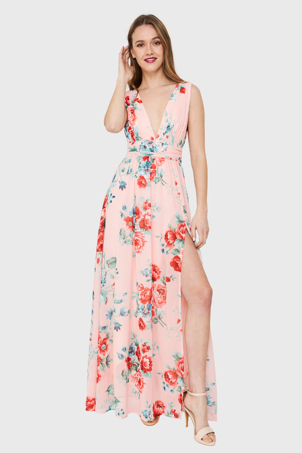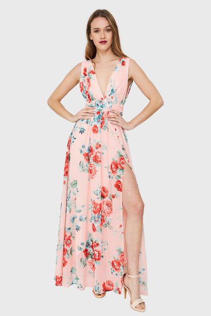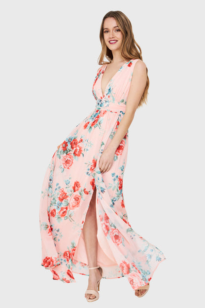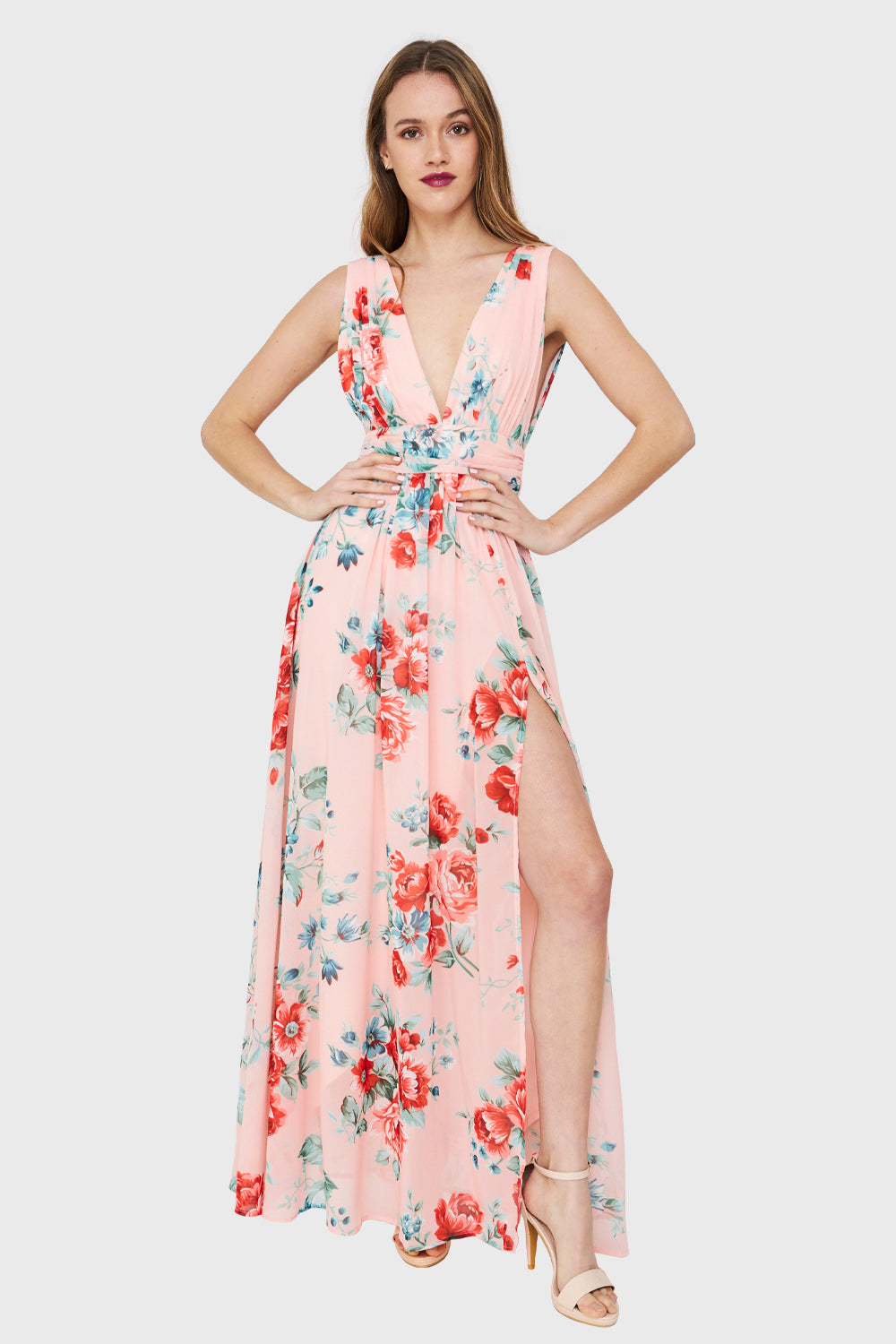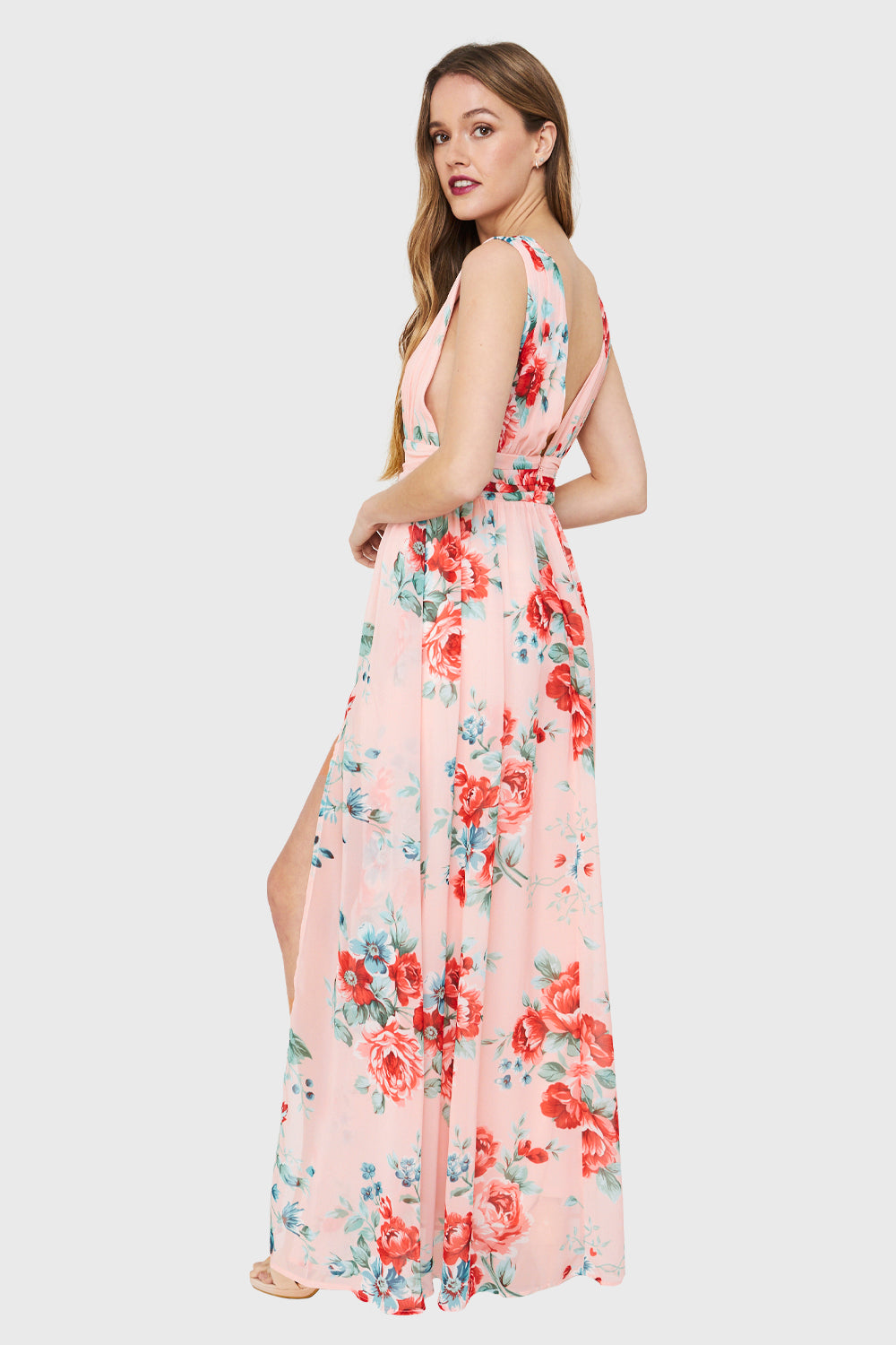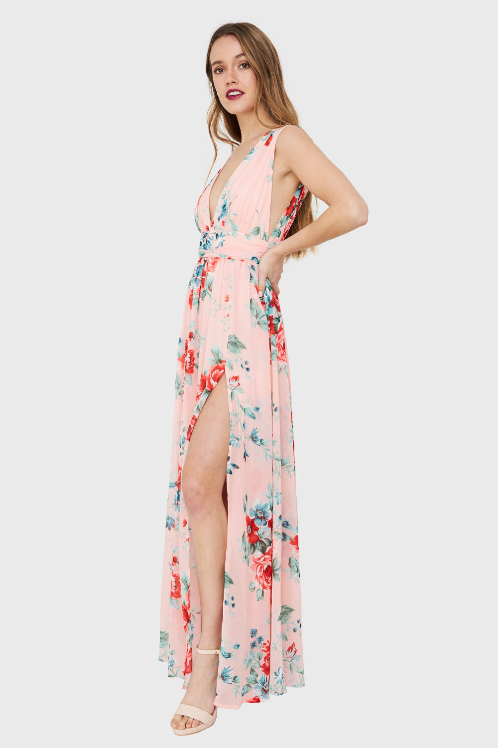 Características: Vestido griego, largo, vaporoso con tajo lateral. Estampado floral. Posee faldón con forro. Antideslizante en hombros. Escote V y cinturón ancho bajo el busto. Posee cierre en espalda.