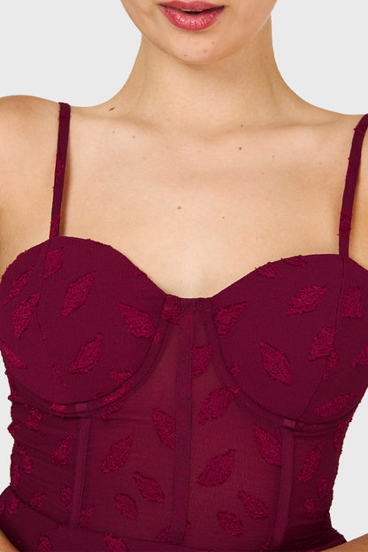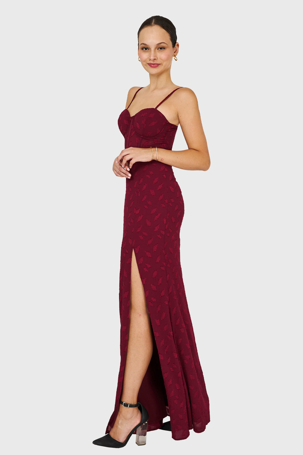 Características: Vestido largo diseño de hojas. Canesú tipo corsé con varillas en cintura y bajo el busto. Tiene relleno en busto. Tirantes pabilo ajustables. Cierre invisible en espalda. Abertura en pierna izquierda desde el medio muslo.Posee forro.