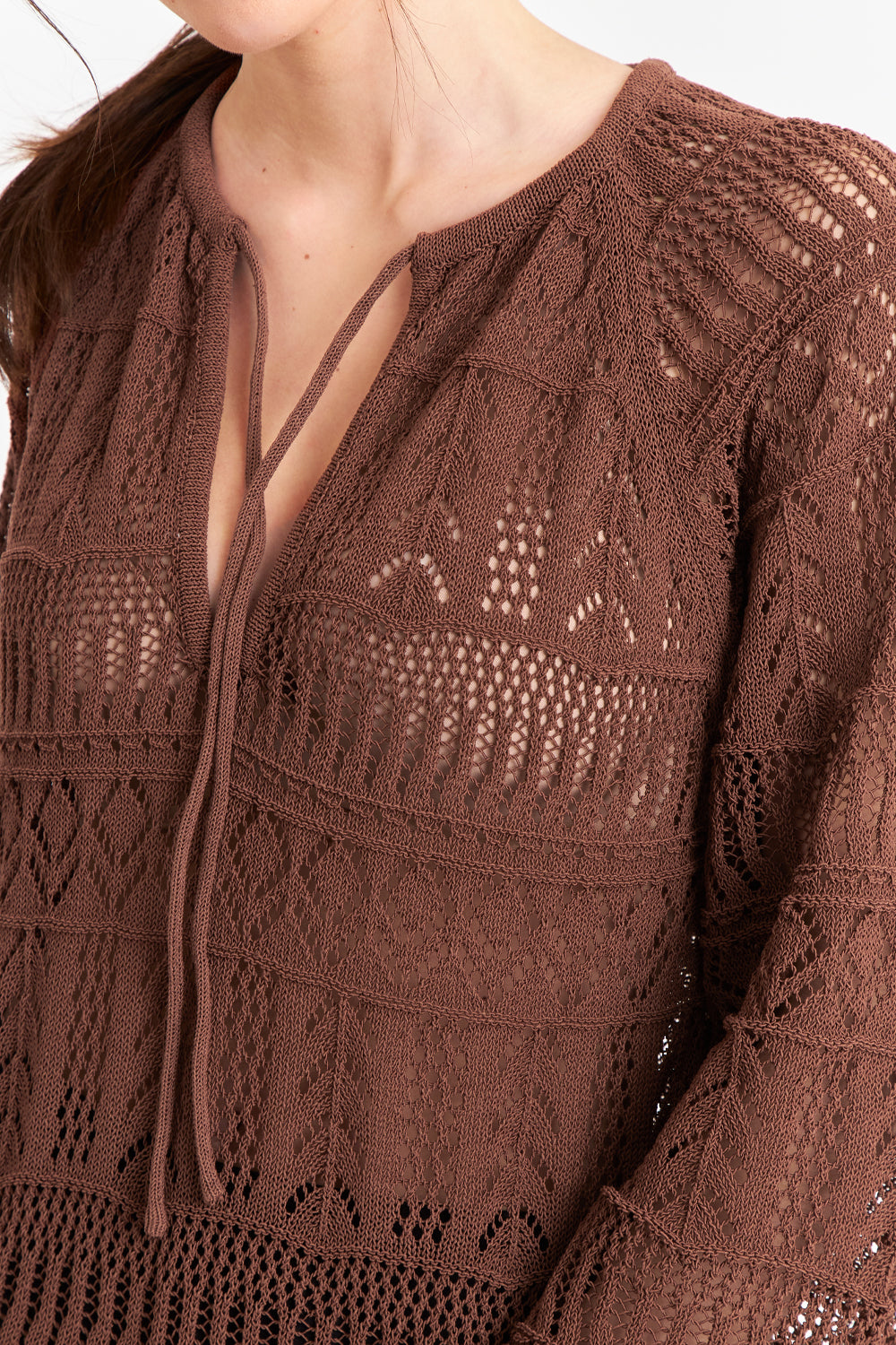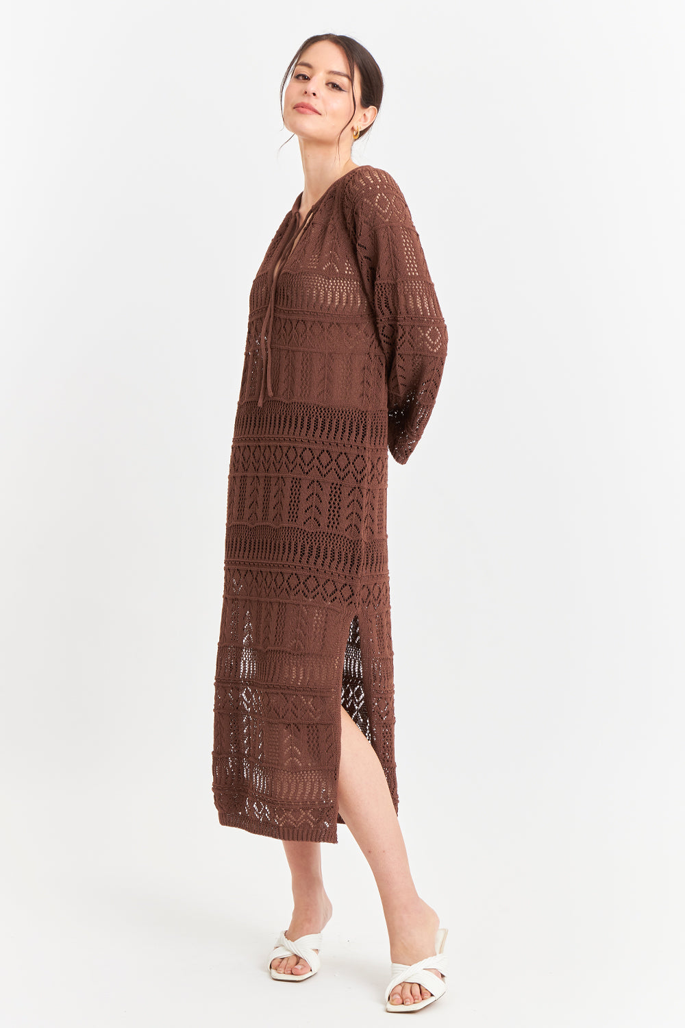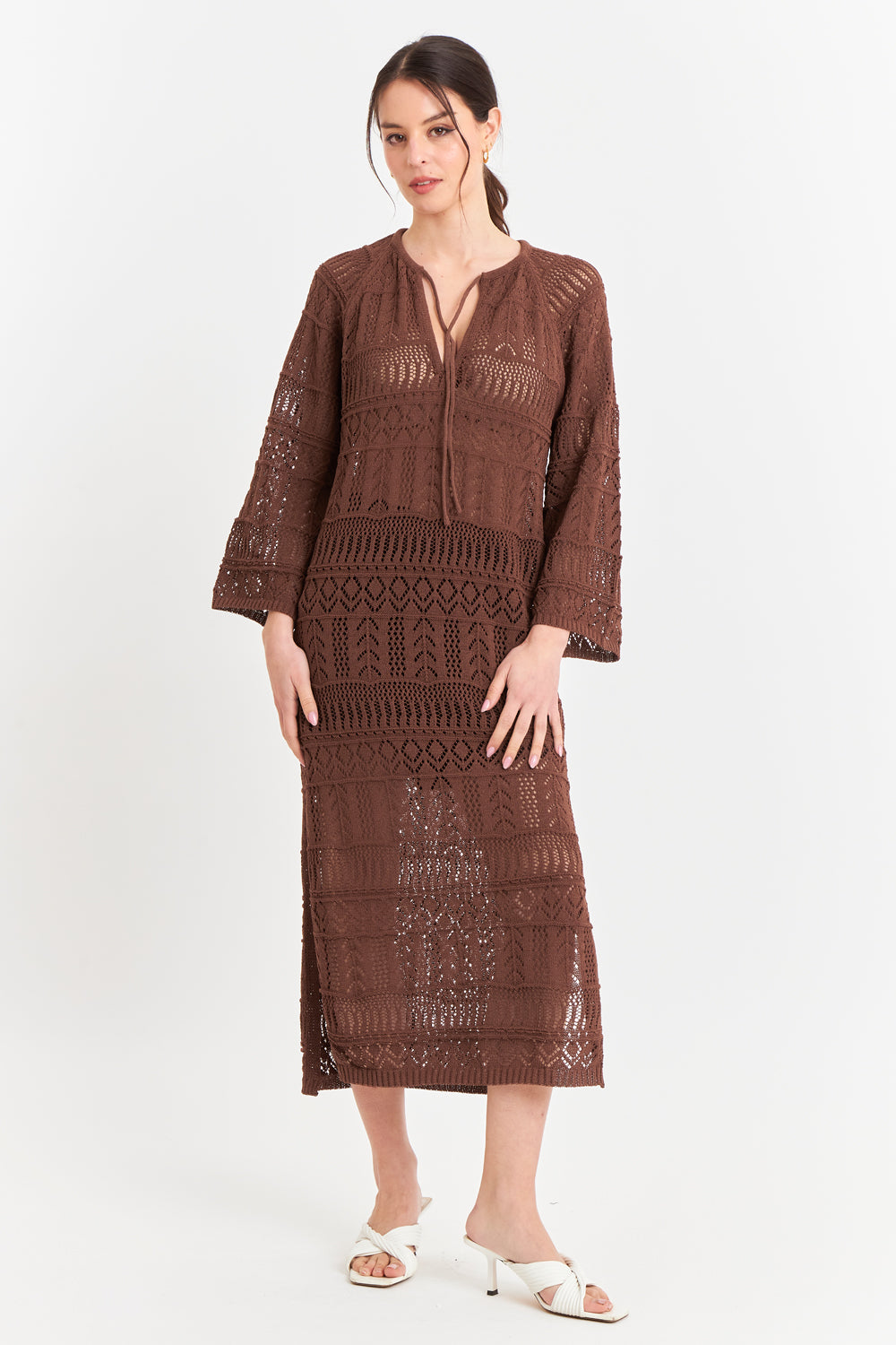 Características: Vestido largo tipo crochet, cuello en V con amarra y mangas largas acampanadas.