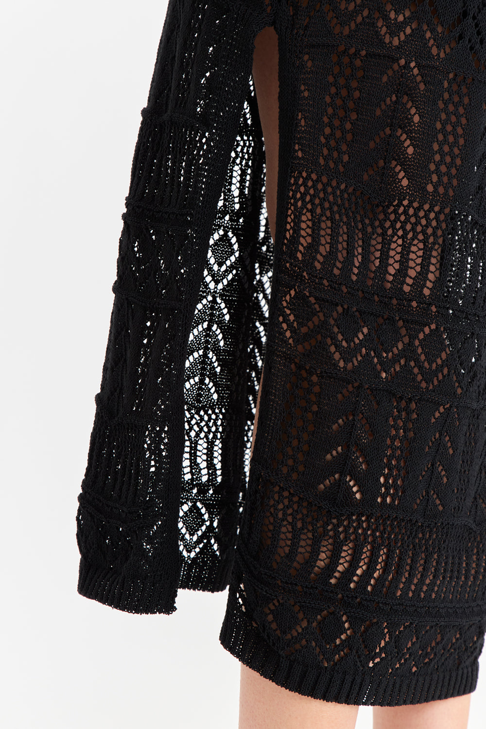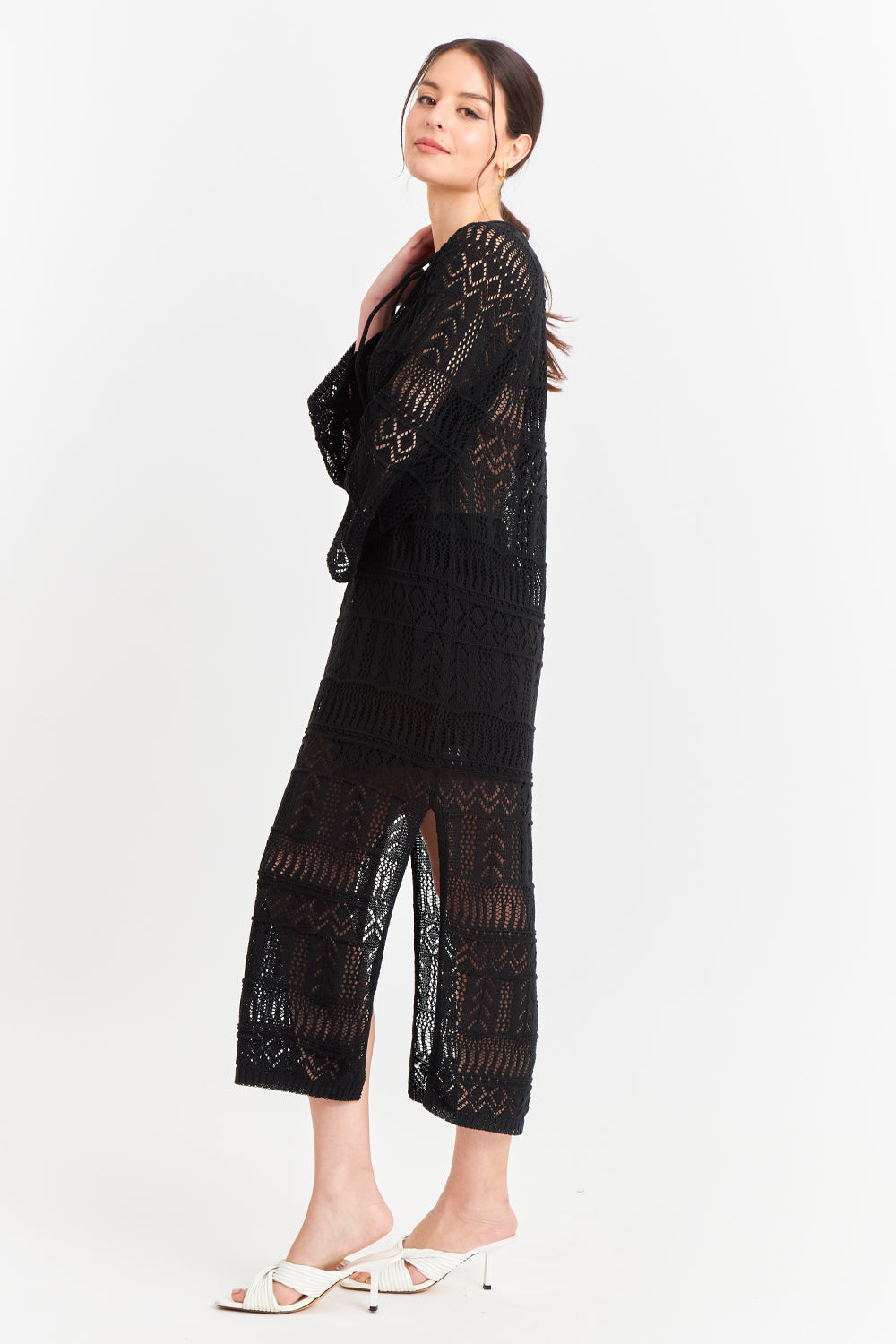 Características: Vestido largo tipo crochet, cuello en V con amarra y mangas largas acampanadas.