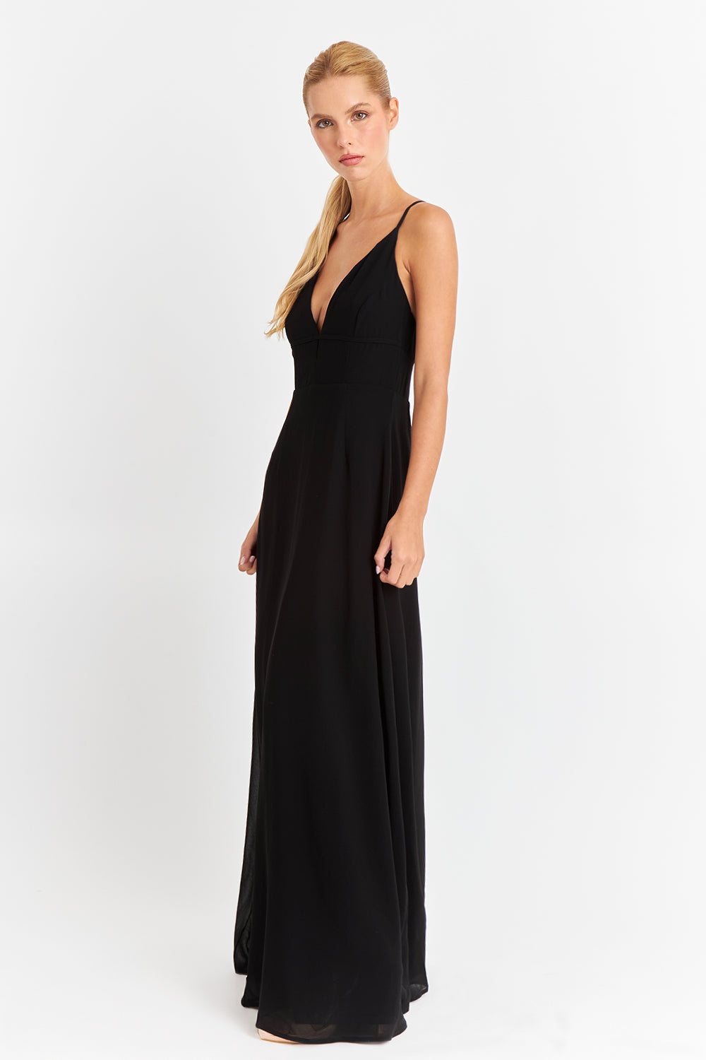 Características: Vestido largo negro de fiesta. Tirantes cruzados en la espalda, detalle decorativo en el pecho, forro interior y cierre trasero.