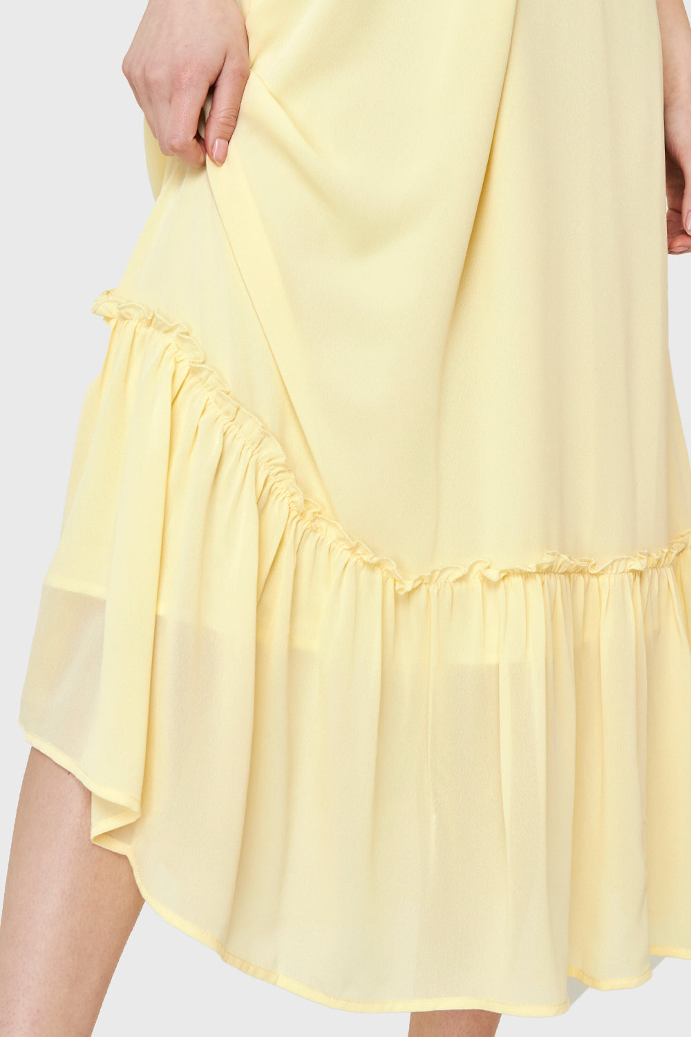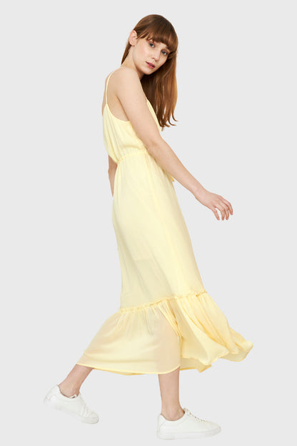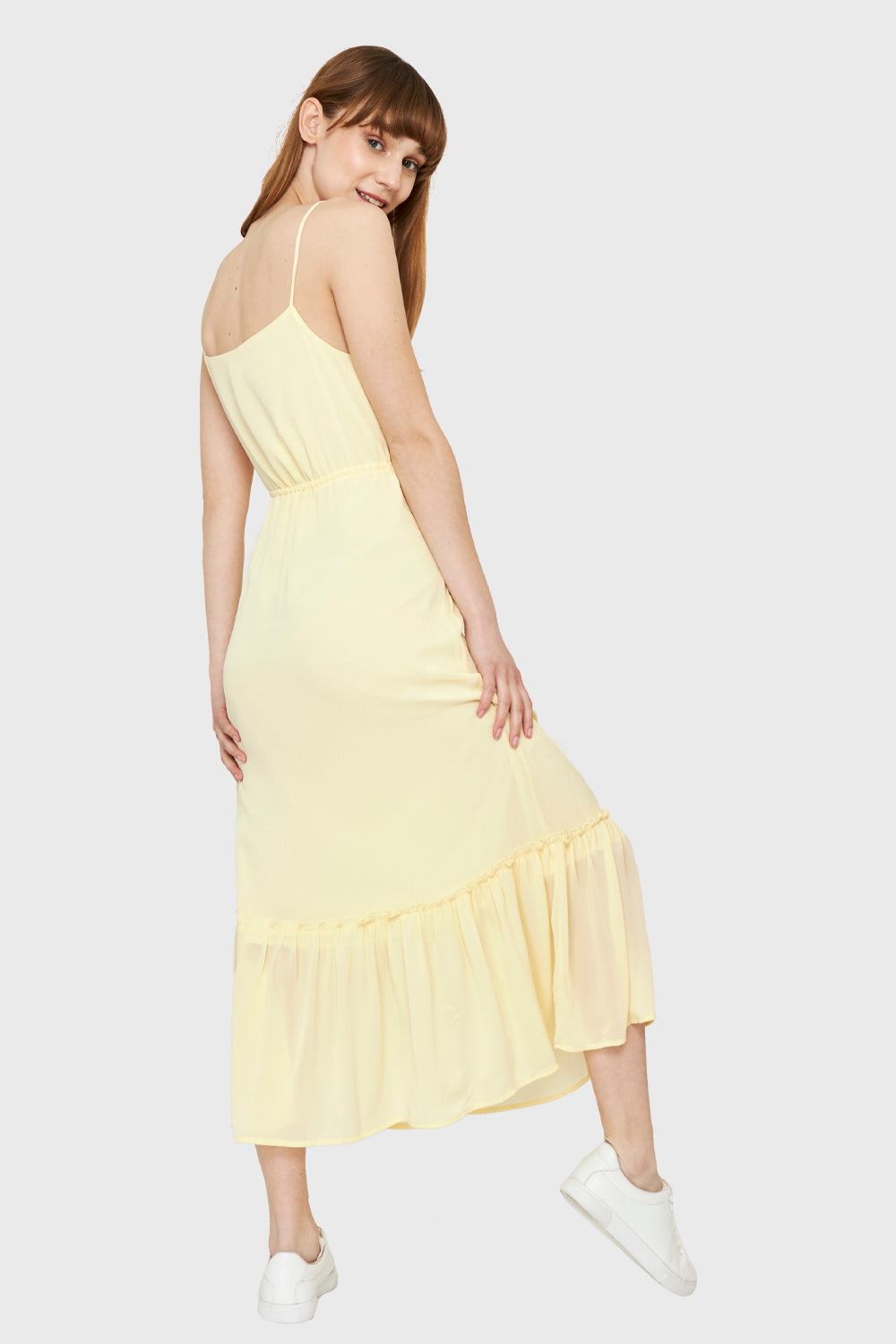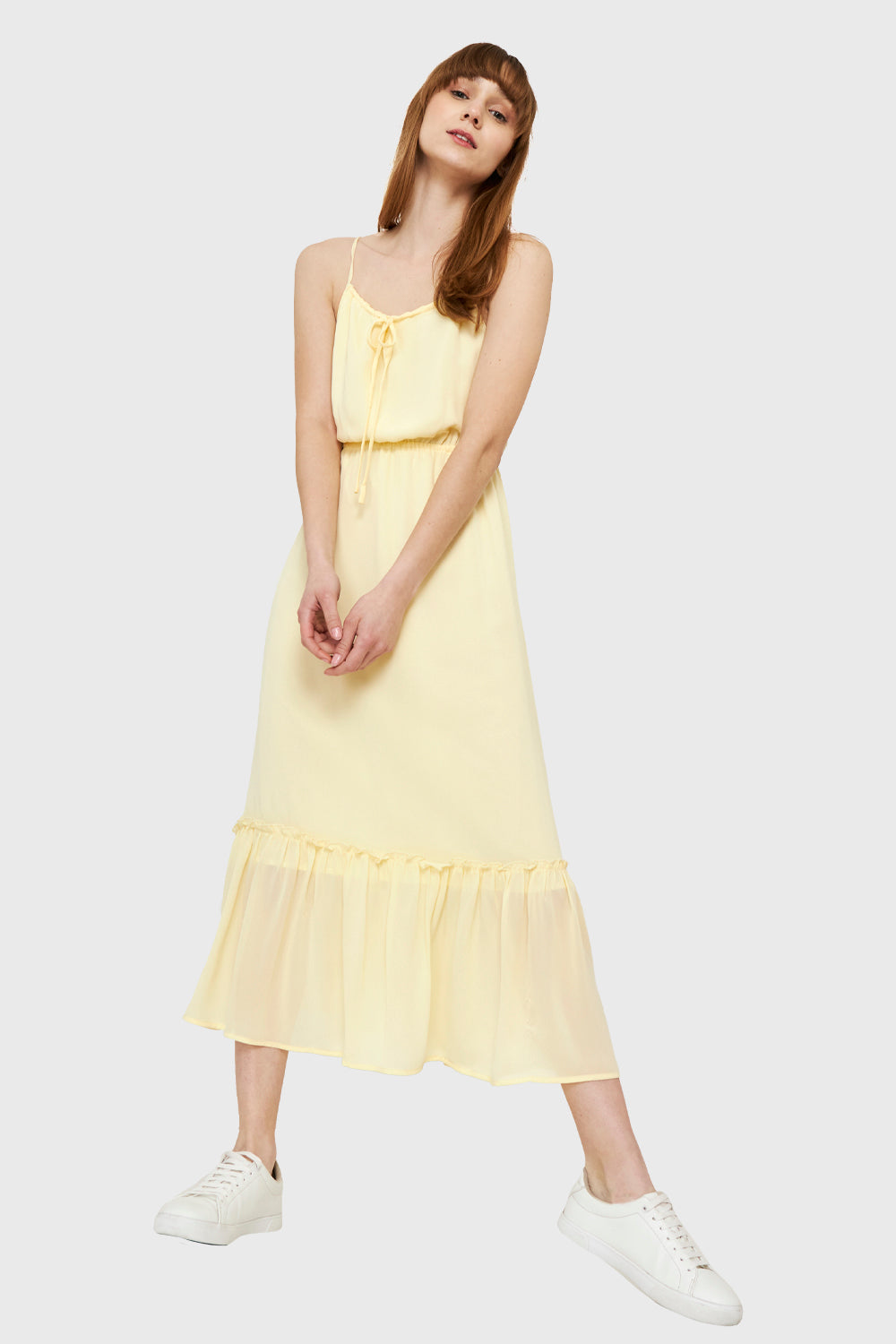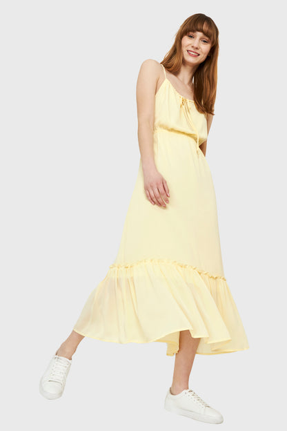 Características: Vestido largo volante con pabilo ajustable a través del cordón que pasa por el escote. Pretina elasticada en cintura. Posee forro.