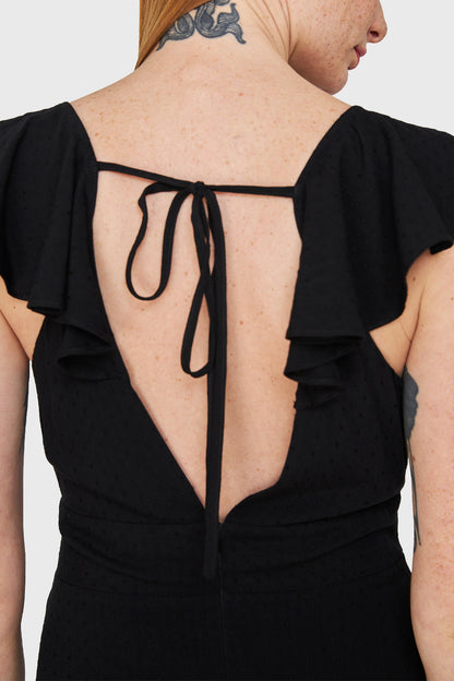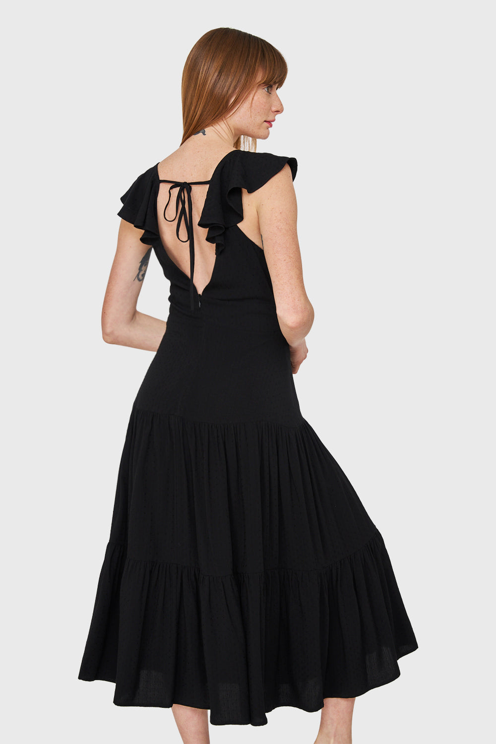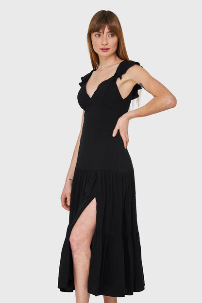 Características: Vestido largo con volantes y tajo. Es forrado y posee cierre invisible en espalda y lazos de ajuste. Escote corazón con vuelitos en hombros