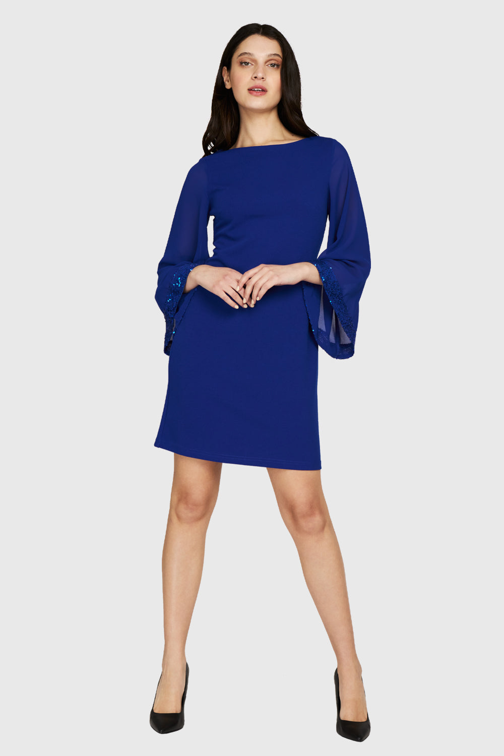 Características: Vestido corto cuello bote. Manga ancha de tela tipo gasa, detalle de lentejuelas en el puño. Cierre invisible con gancho de ajuste en la espalda. Posee forro.