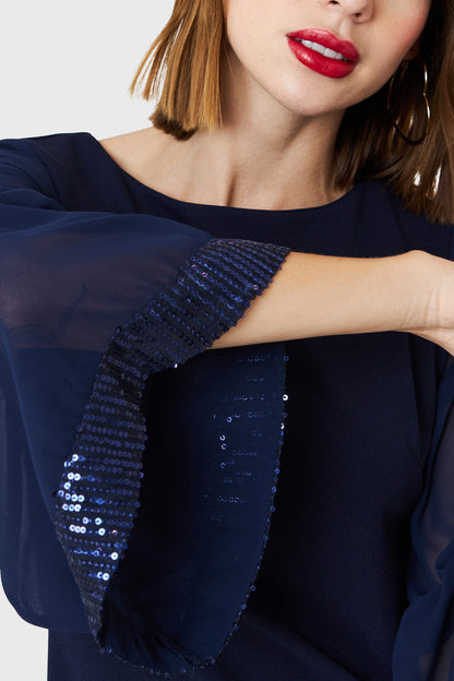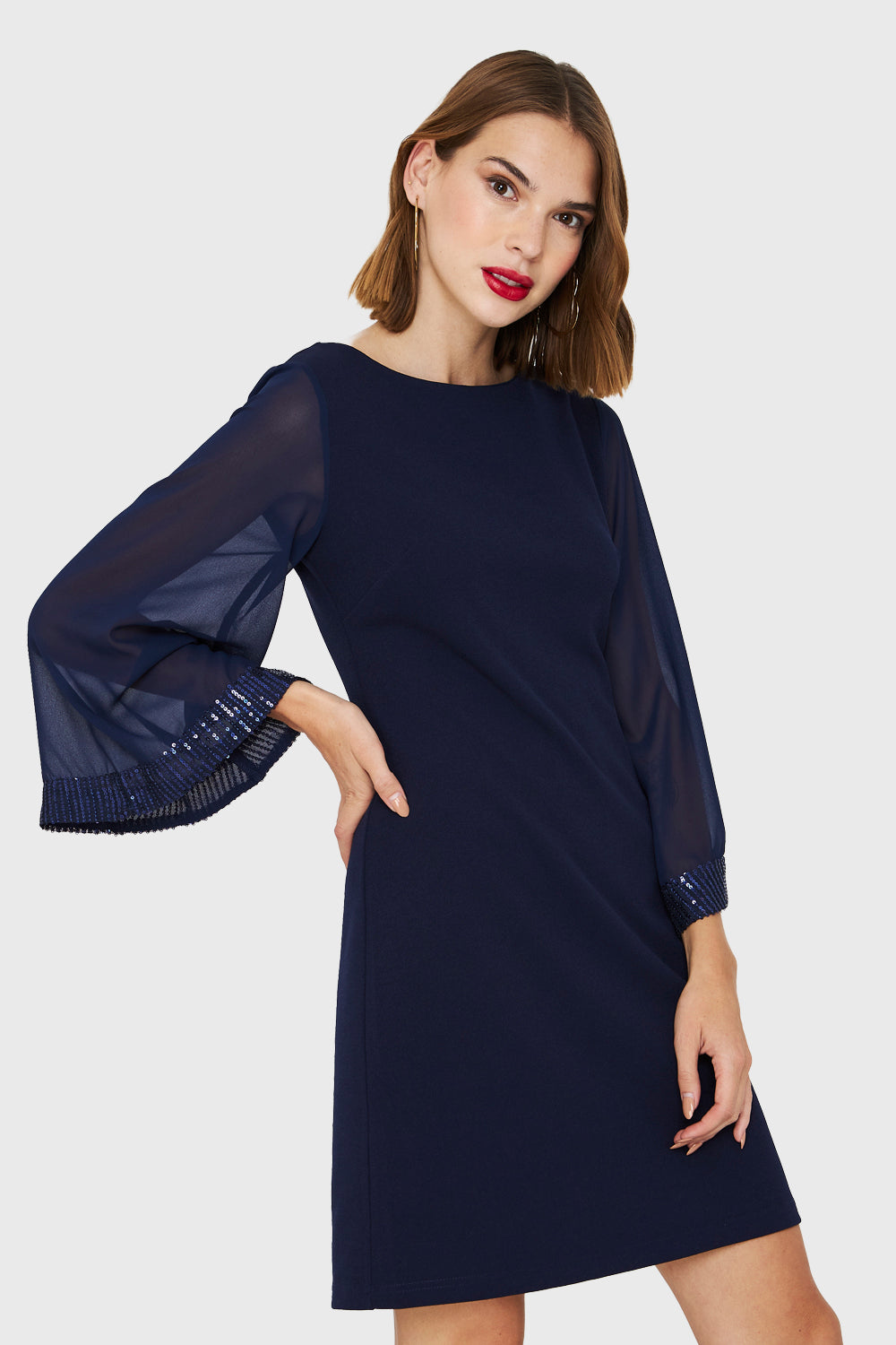 Características: Vestido corto cuello bote. Manga ancha de tela tipo gasa, detalle de lentejuelas en el puño. Cierre invisible con gancho de ajuste en la espalda. Posee forro.