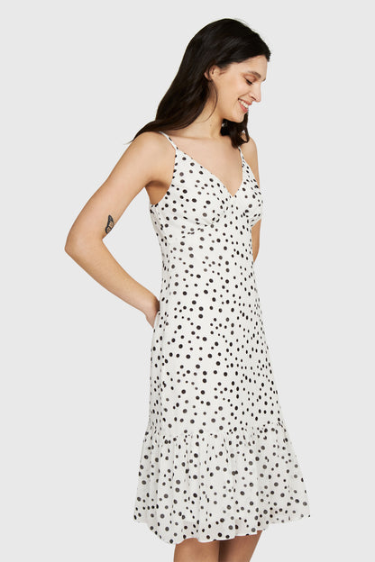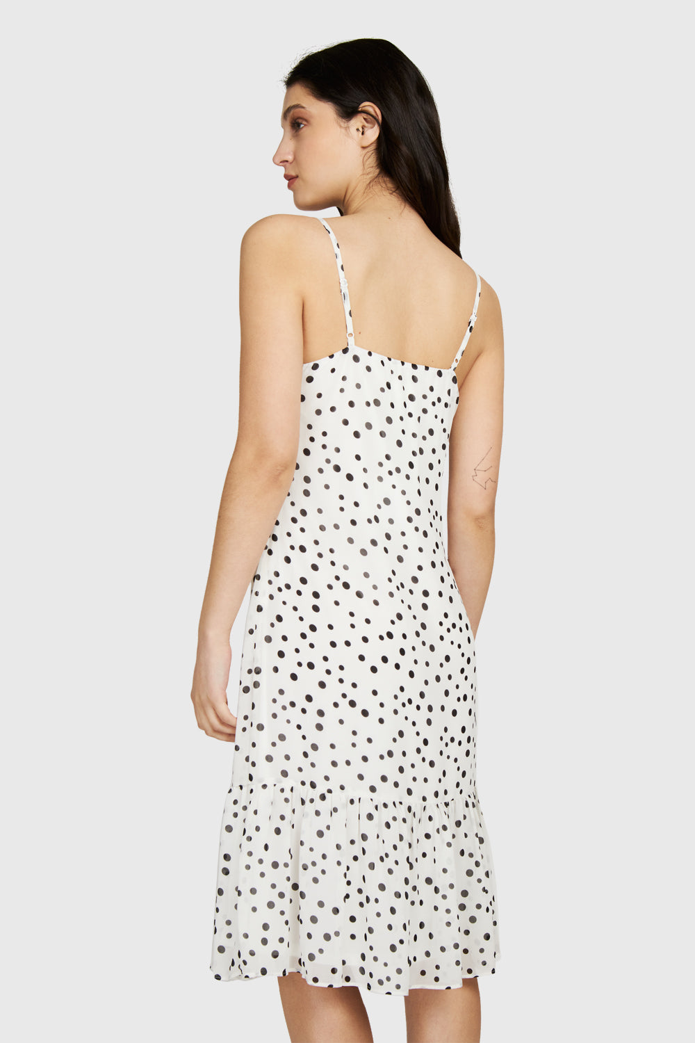 Características: Vestido midi con tirantes estilo pabilo ajustables print lunares. Cierre invisible al costado. Faldón con vuelitos en la parte inferior. Posee forro.