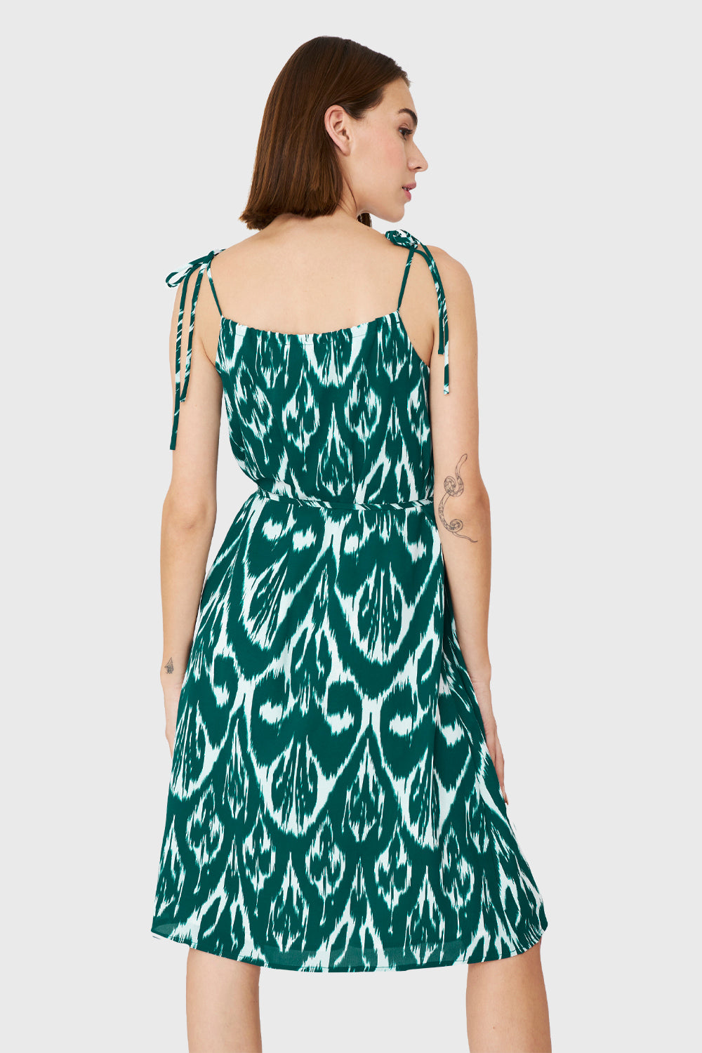 Características: Vestido midi print étnico con tiras que se pueden ajustar a través de nudos. Los tirantes pasan por el cuello pudiendo también ajustarlas a gusto. Lazo de ajuste en cintura. Posee forro.