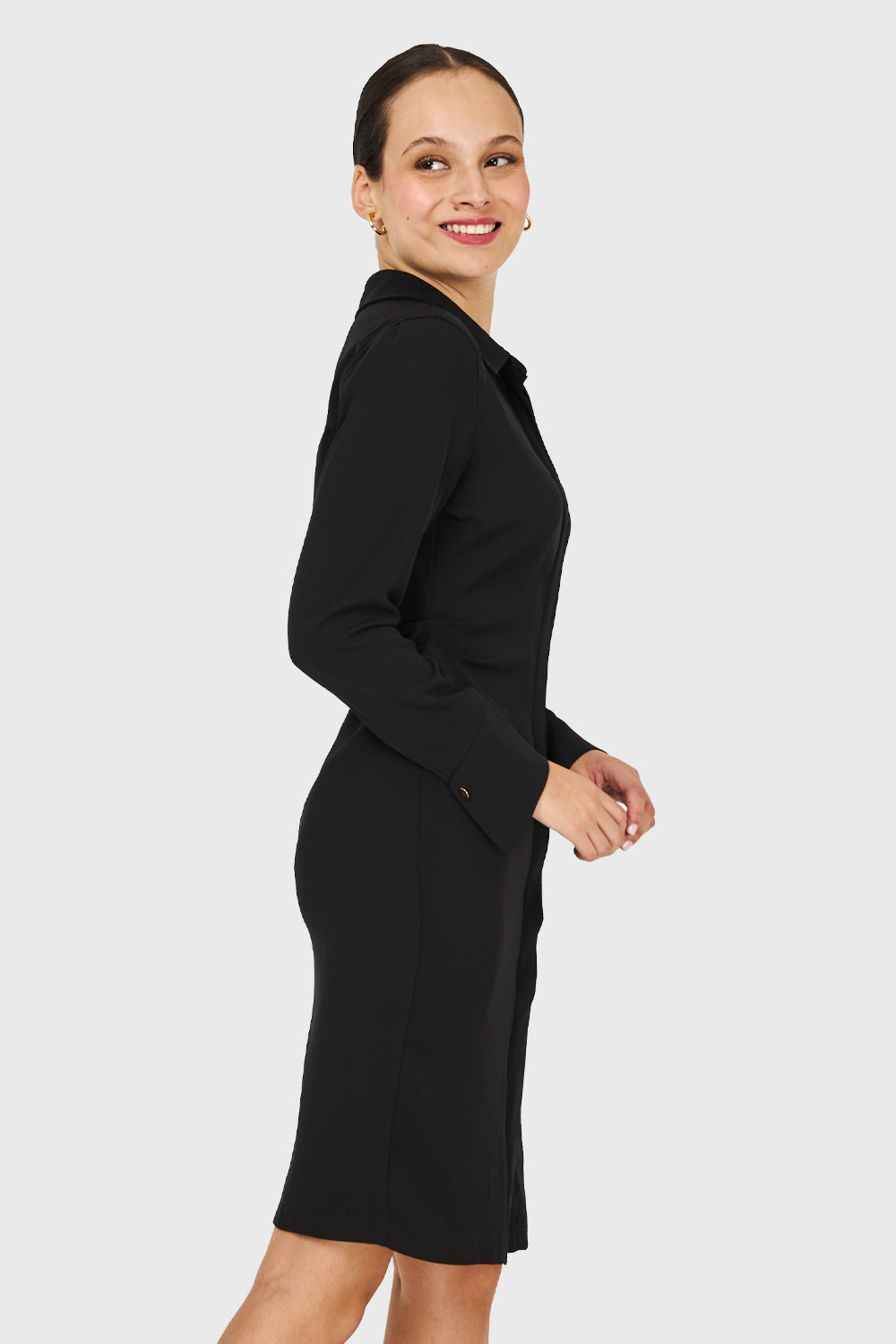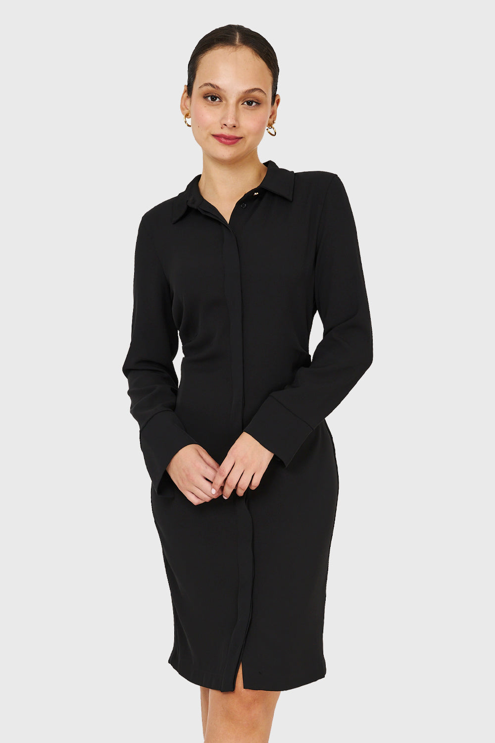 Características: Vestido camisero manga larga. Botonera invisible por todo el largo del delantero. Posee pliegues en cintura para acentuar la silueta. Sin forro.