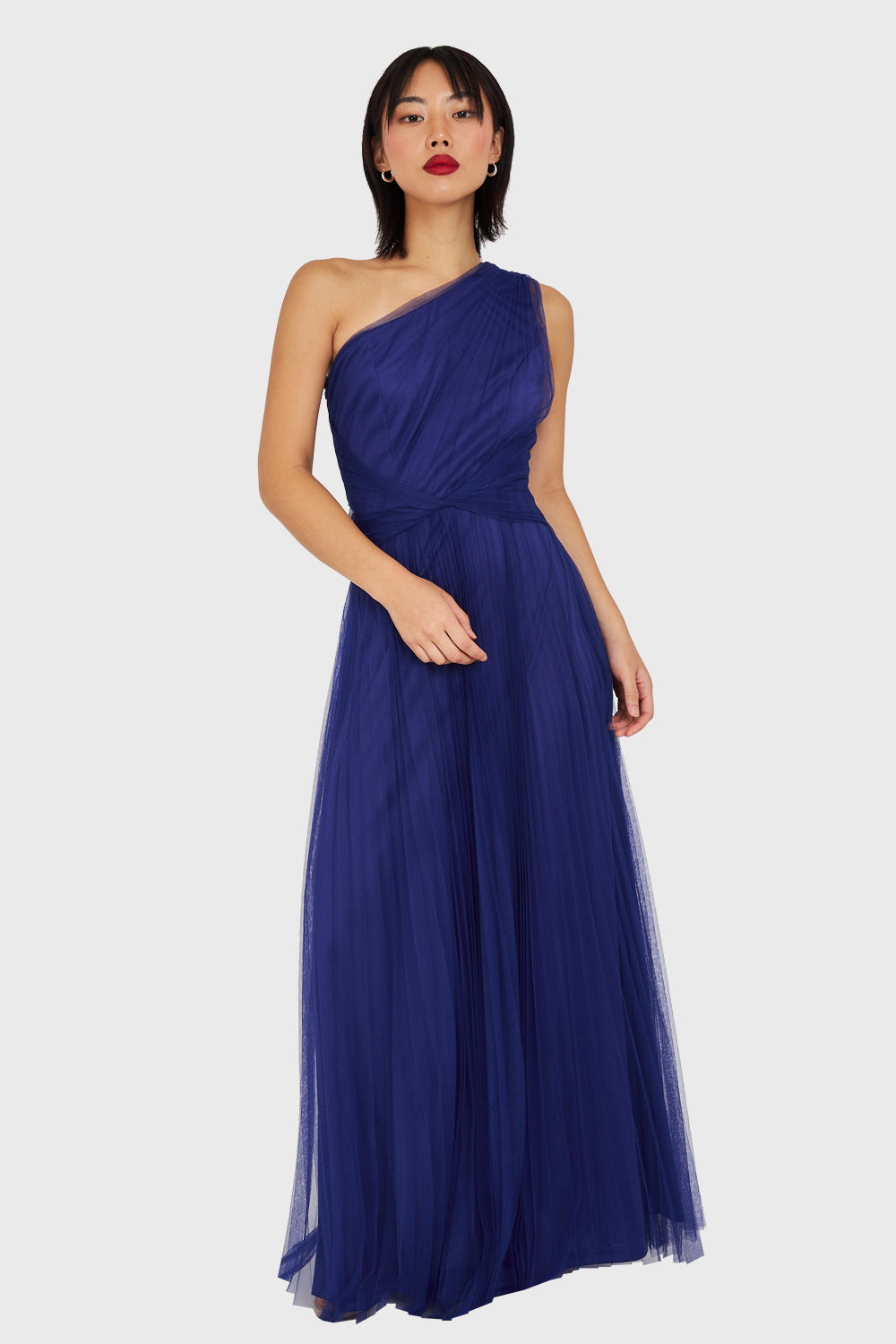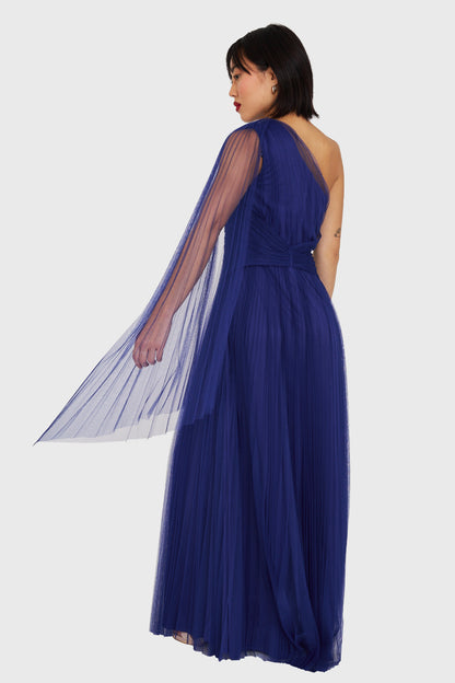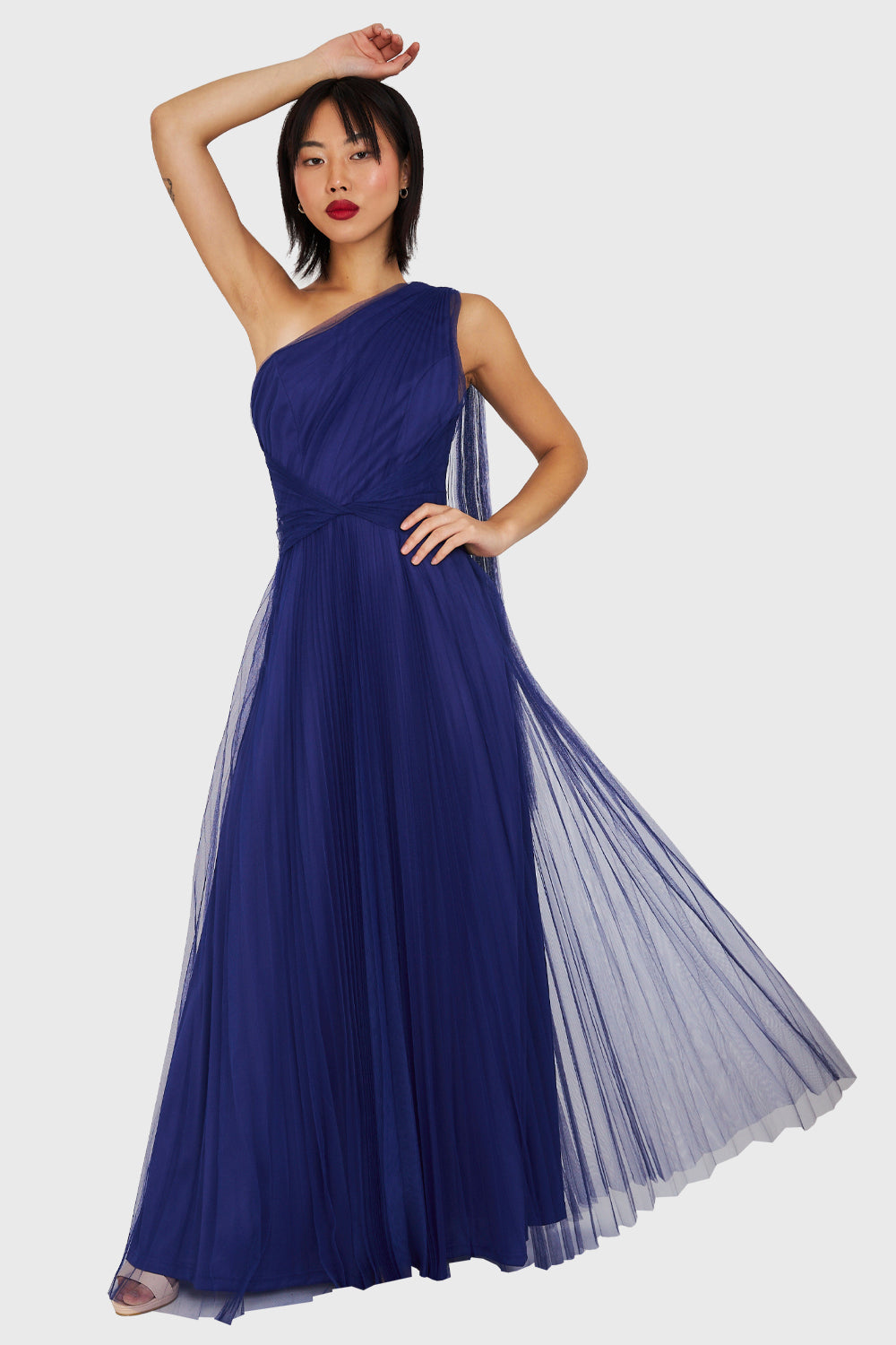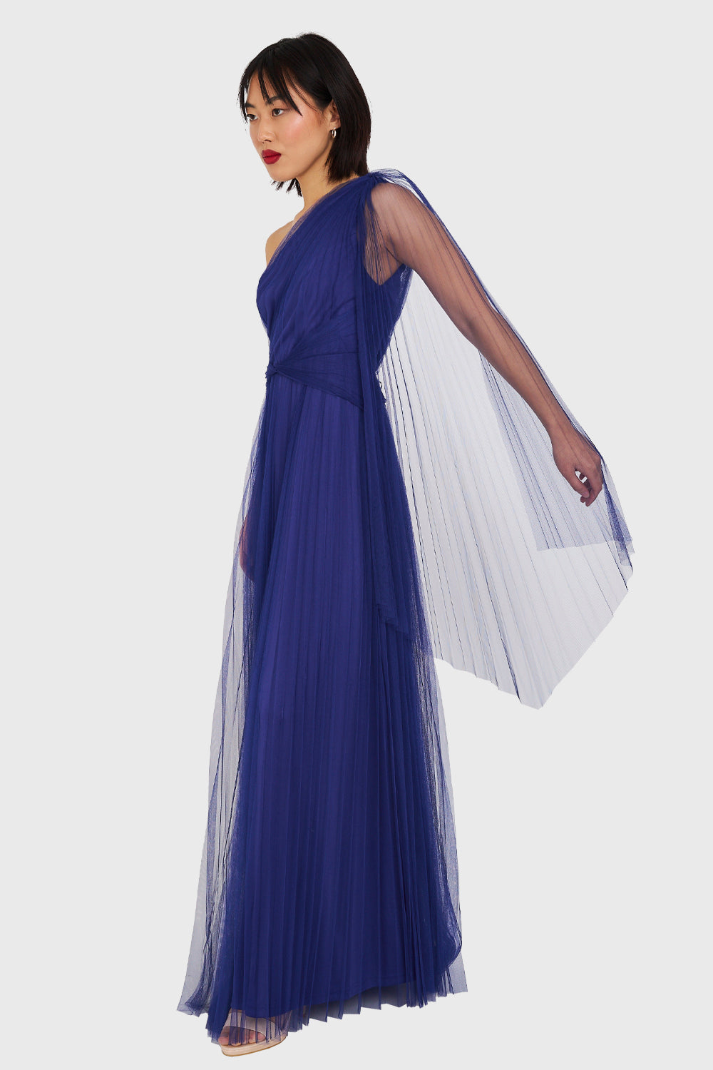 Características: Vestido formal plisado con escote asimétrico y tela que cae desde el hombro. Posee cierre invisible al costado y forro.