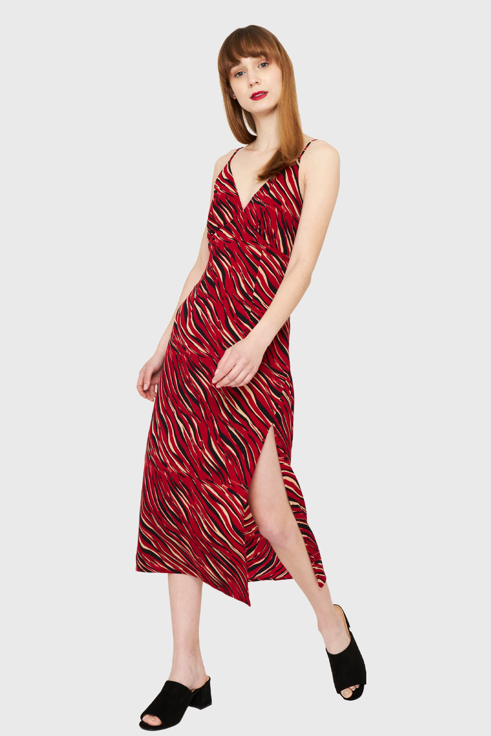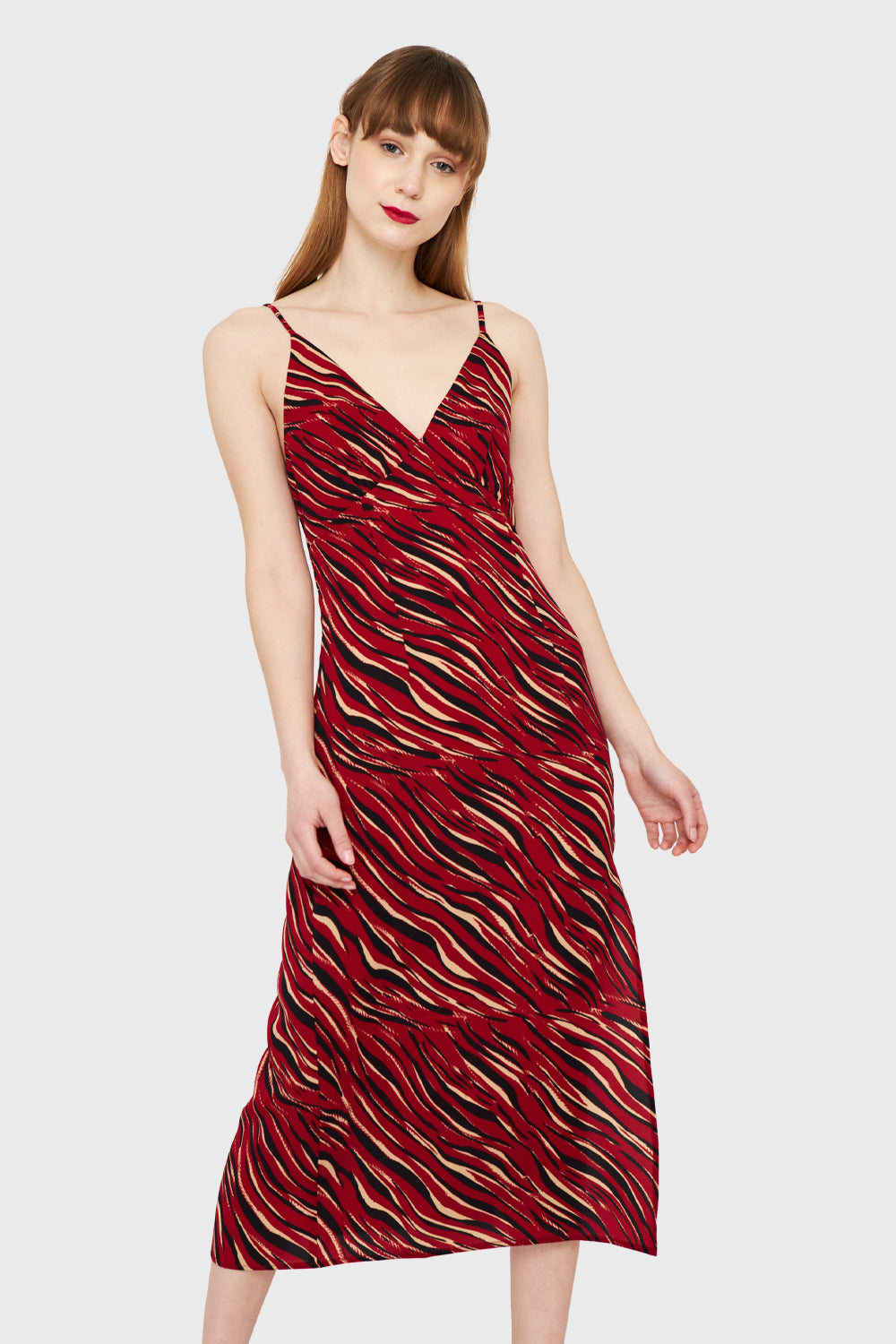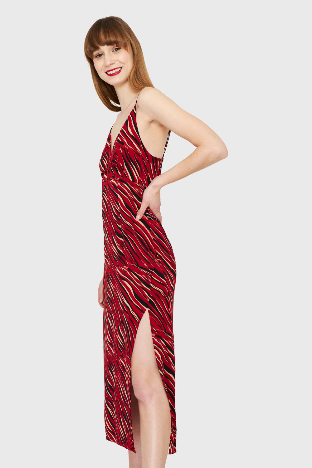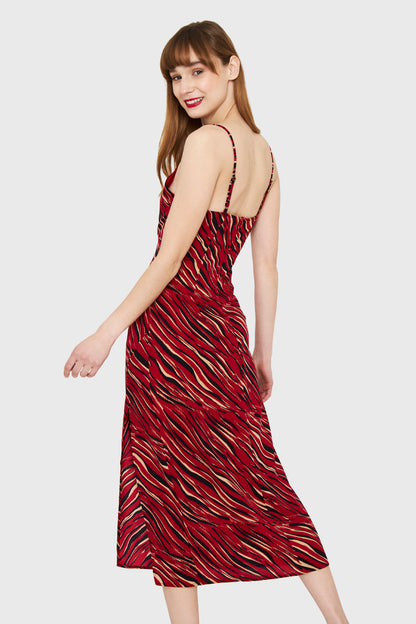 Características: Vestido midi con tirantes pabilo ajustables print cebra. Cierre invisible en espalda. Abertura lateral hasta el muslo. No posee forro.