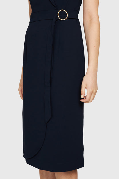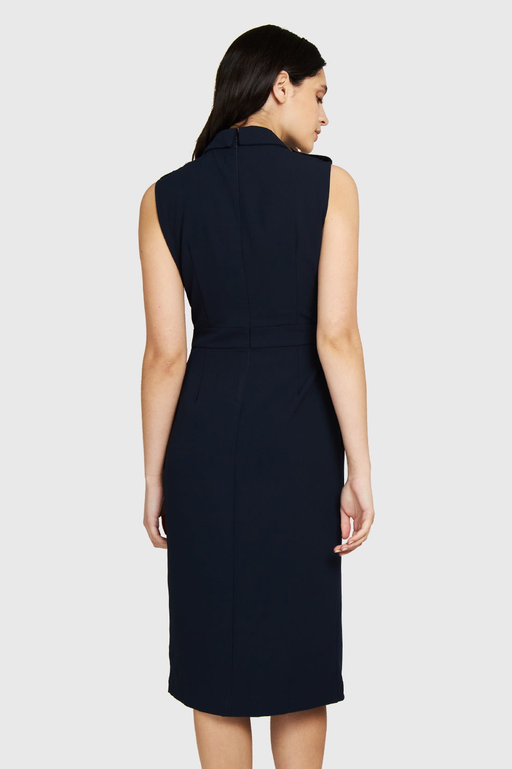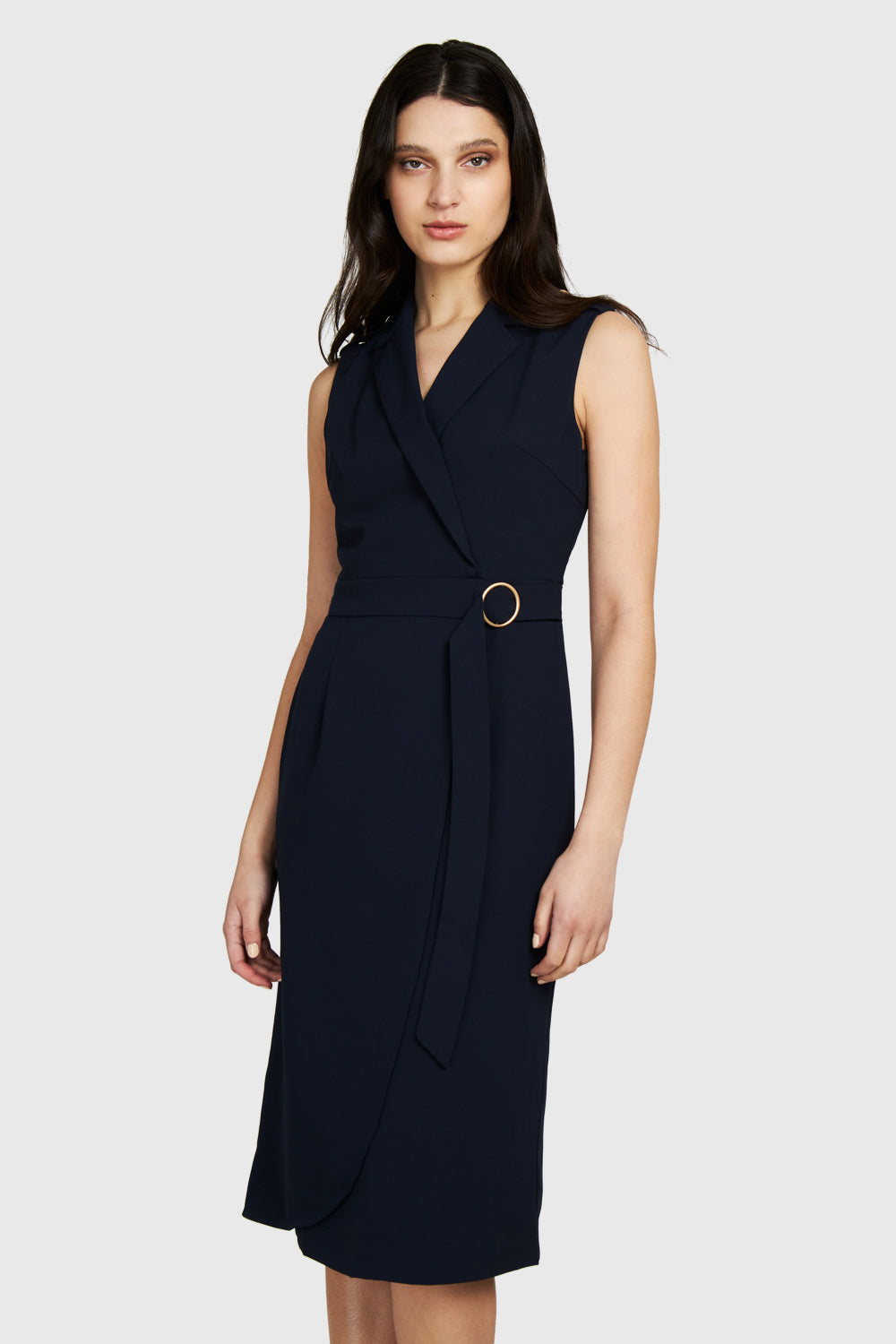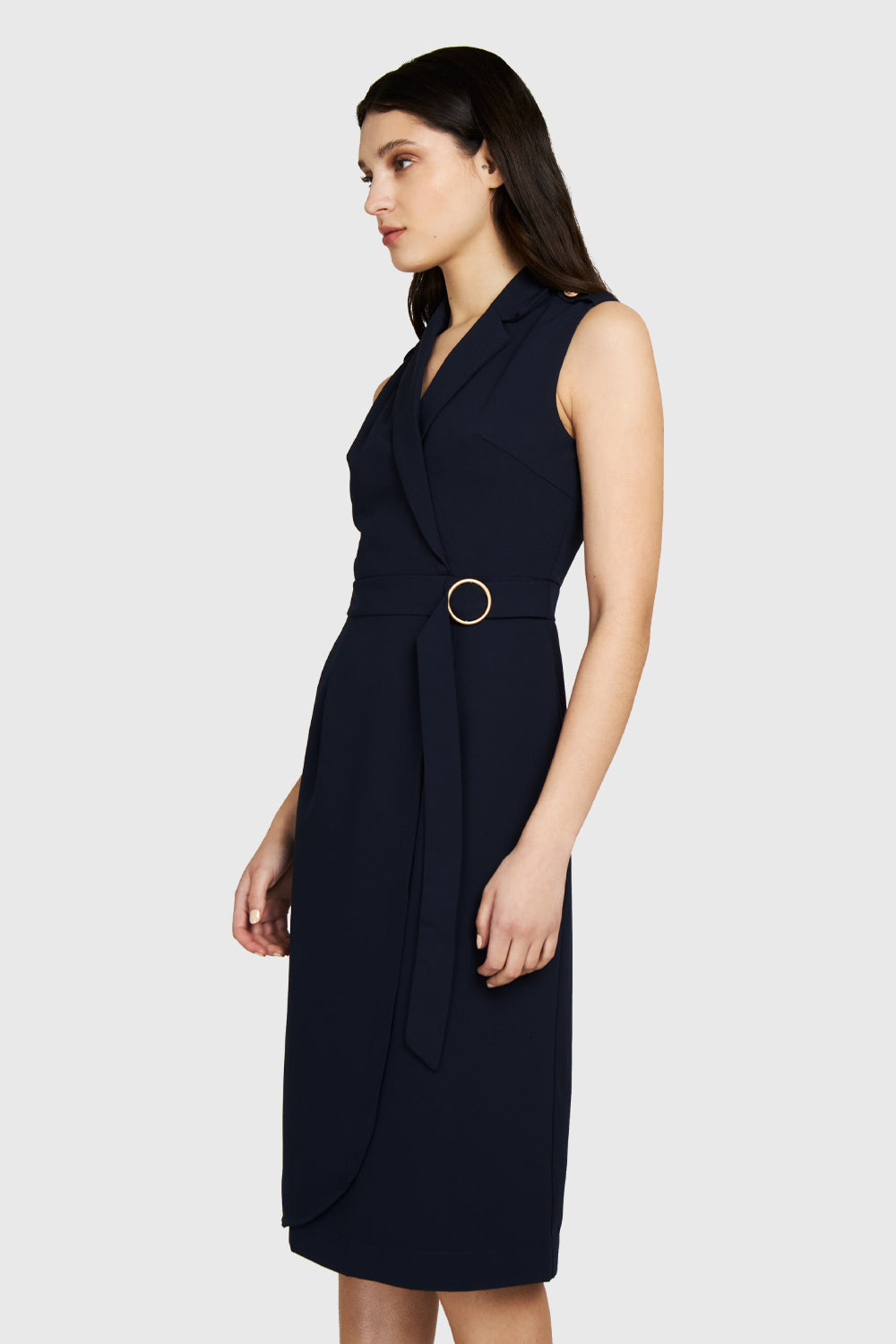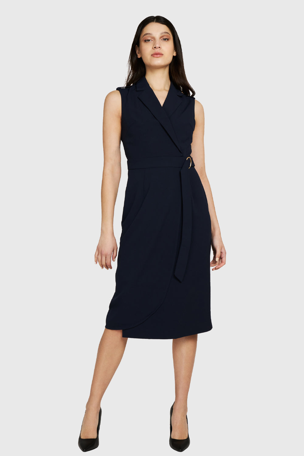 Características: Vestido midi con escote tipo solapa cruzada. Cierre en parte posterior, botones decorativos en hombros. Lazo con hebilla decorativa en la cintura. Faldón con abertura que da un efecto cruzado. Posee forro.