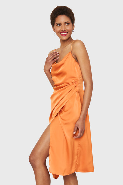Vestido Tipo Satín Detalles Drapeados Naranja