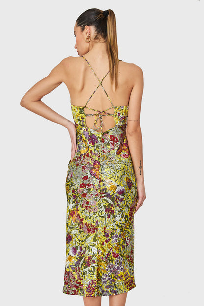Características: Vestido largo tipo satín con estampado floral y tajo. Escote recto con tirantes ajustables que se cruzan en espalda. Busto fruncido forrado. Posee cierre invisible en espalda.