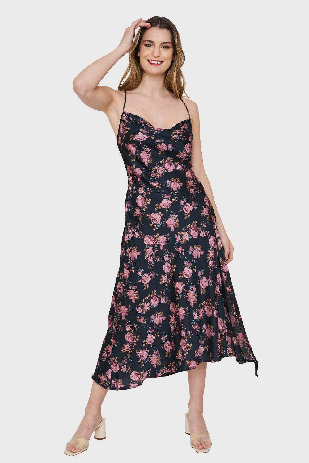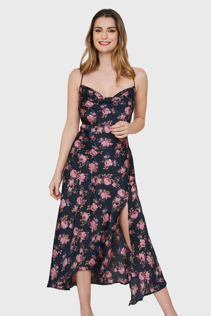 Características: Vestido Largo tipo satín estampado floral con tajo lateral, espalda cruzada tirante ajustable.
