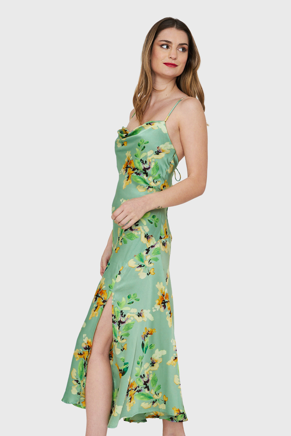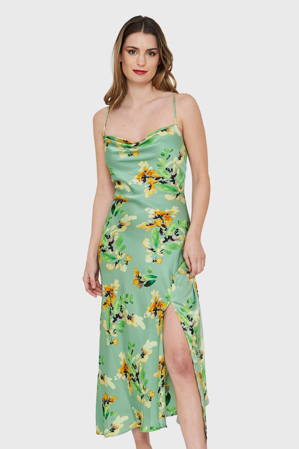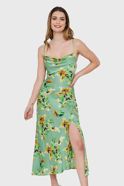 Vestido Tipo Satín Tajo Floral Verde