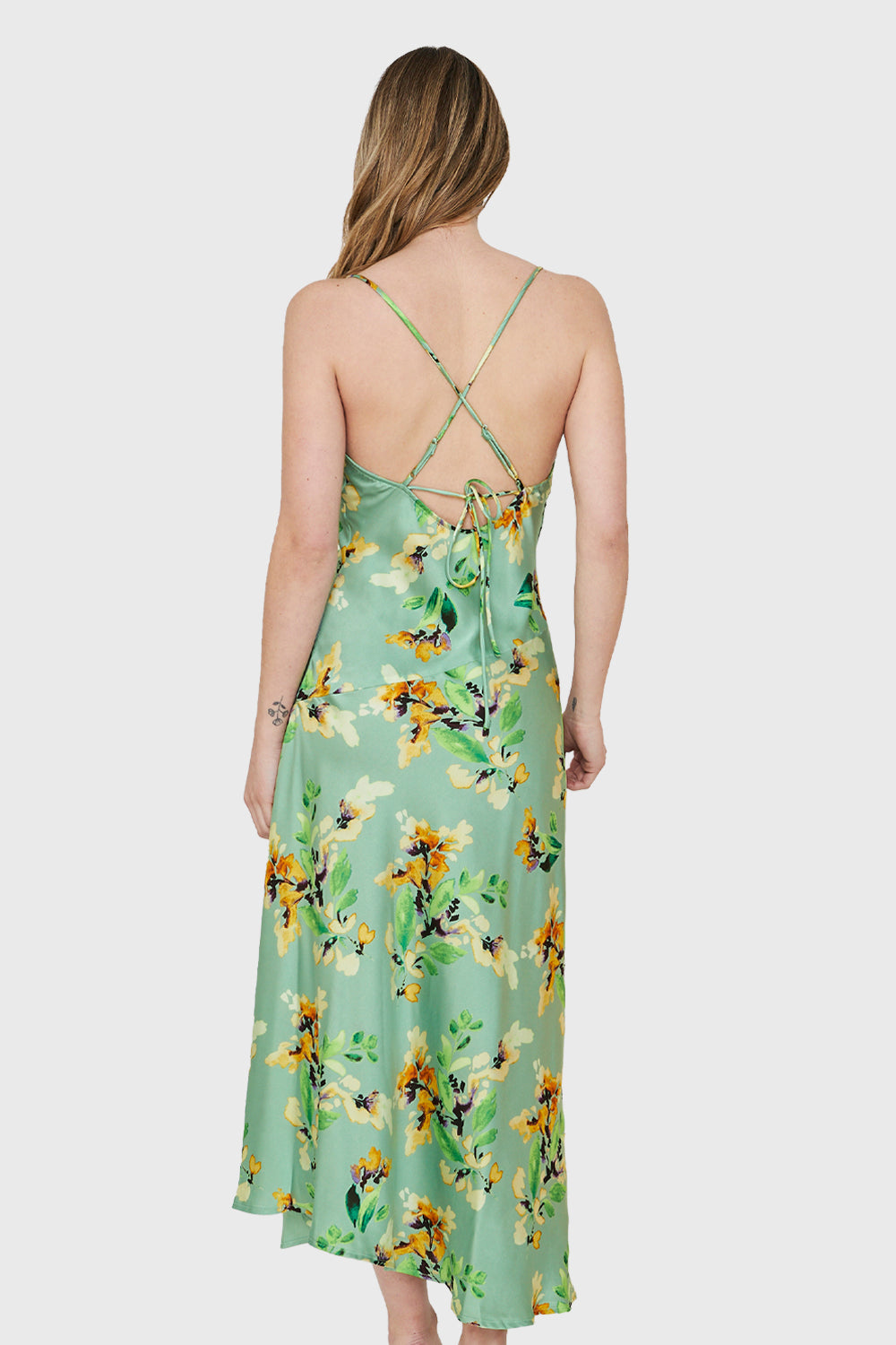 Características: Vestido Largo tipo satín estampado floral con tajo lateral, espalda cruzada tirante ajustable.
