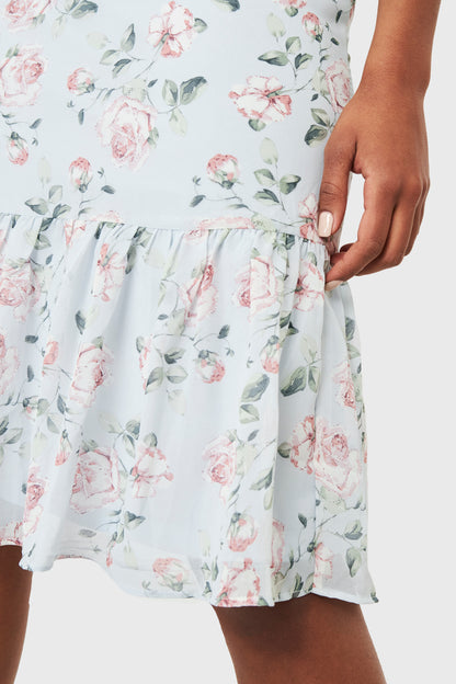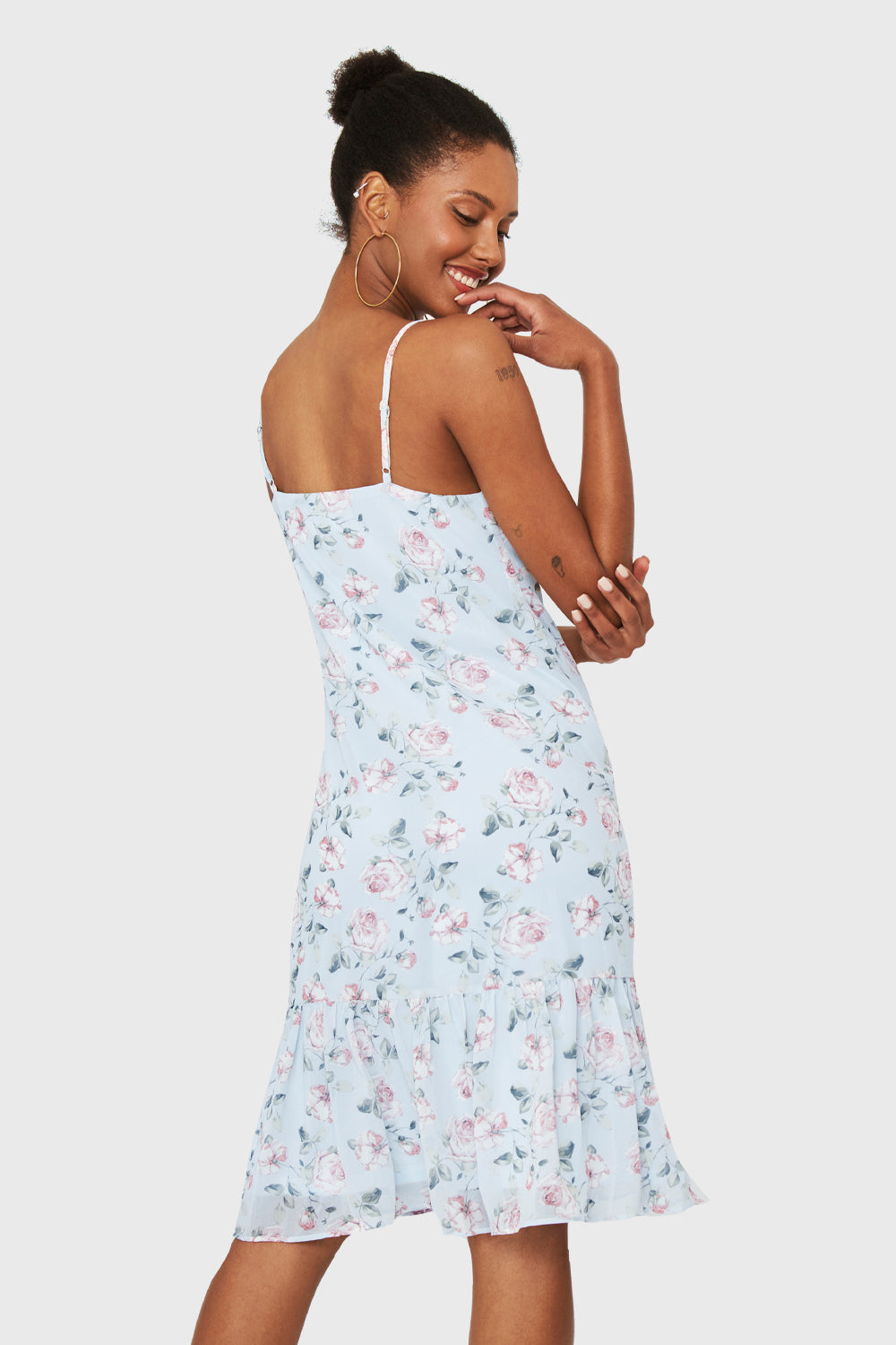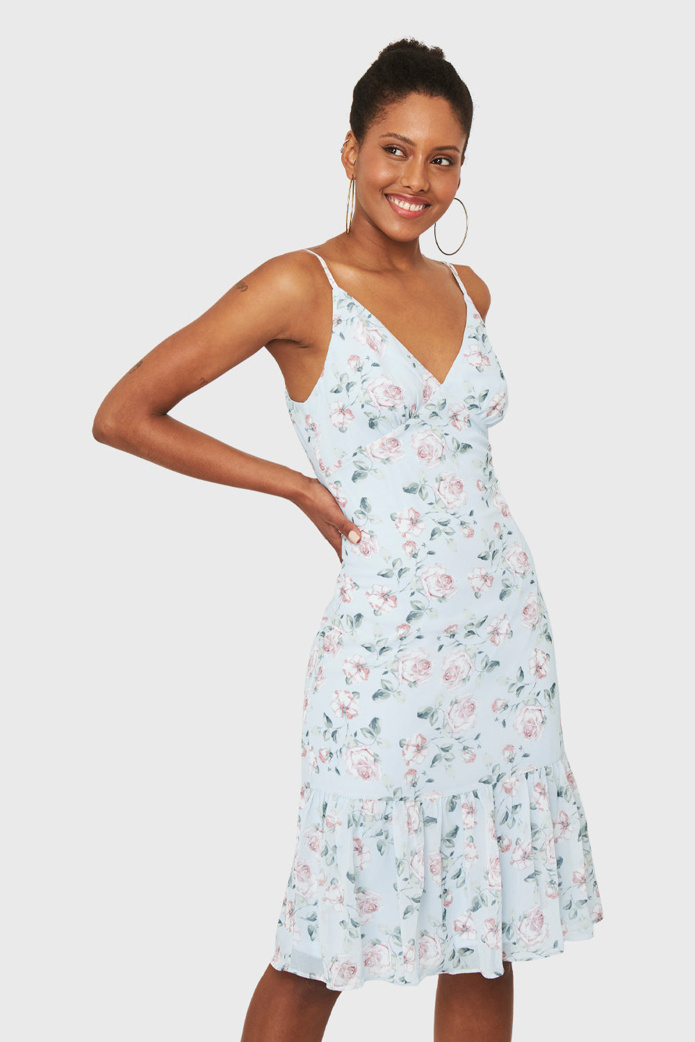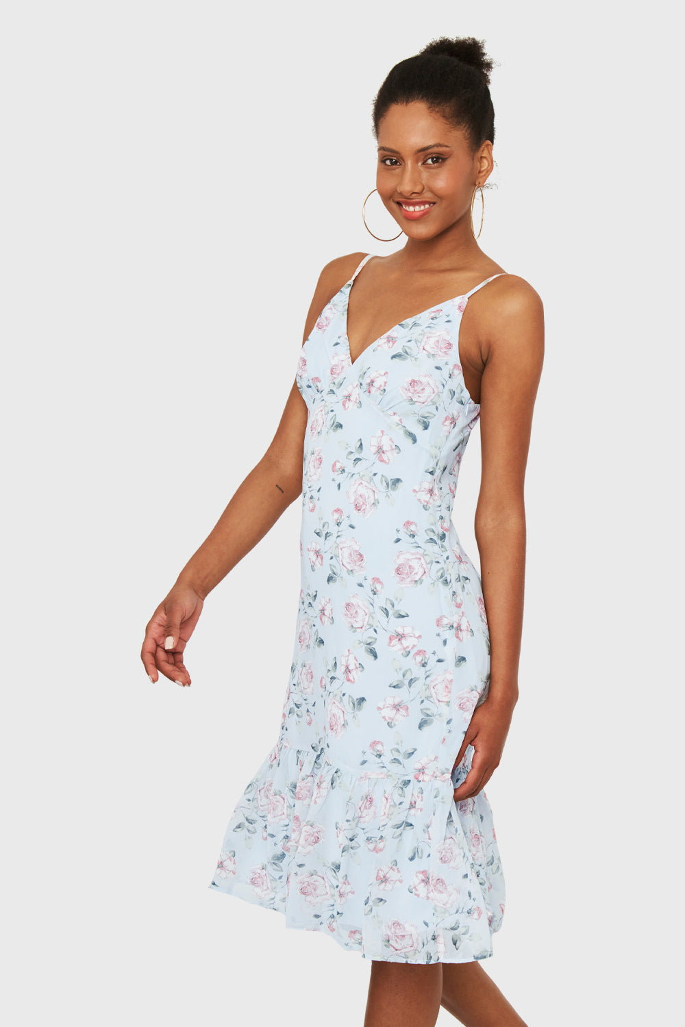 Características: Vestido midi con terminación de volante en el faldón. Estampado floral de rosas. Tirantes ajustables estilo pabilo. Escote en V. Cierre invisible al costado. Posee forro.