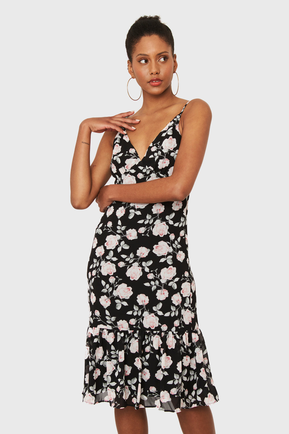 Características: Vestido midi con terminación de volante en el faldón. Estampado floral de rosas. Tirantes ajustables estilo pabilo. Escote en V. Cierre invisible al costado. Posee forro.