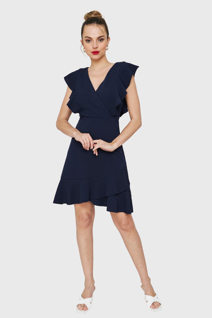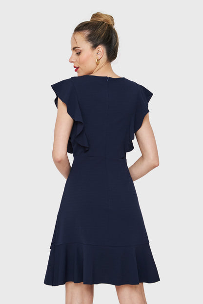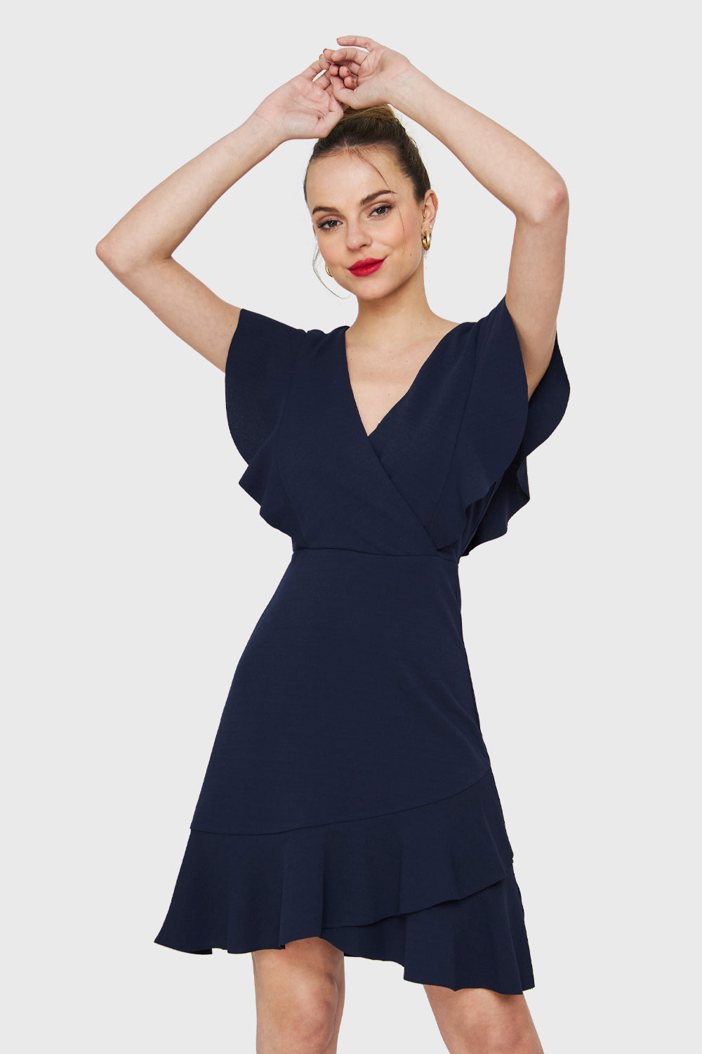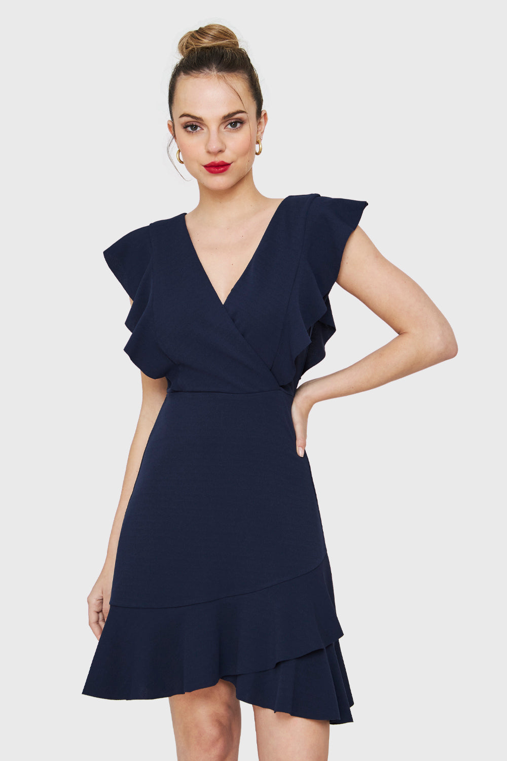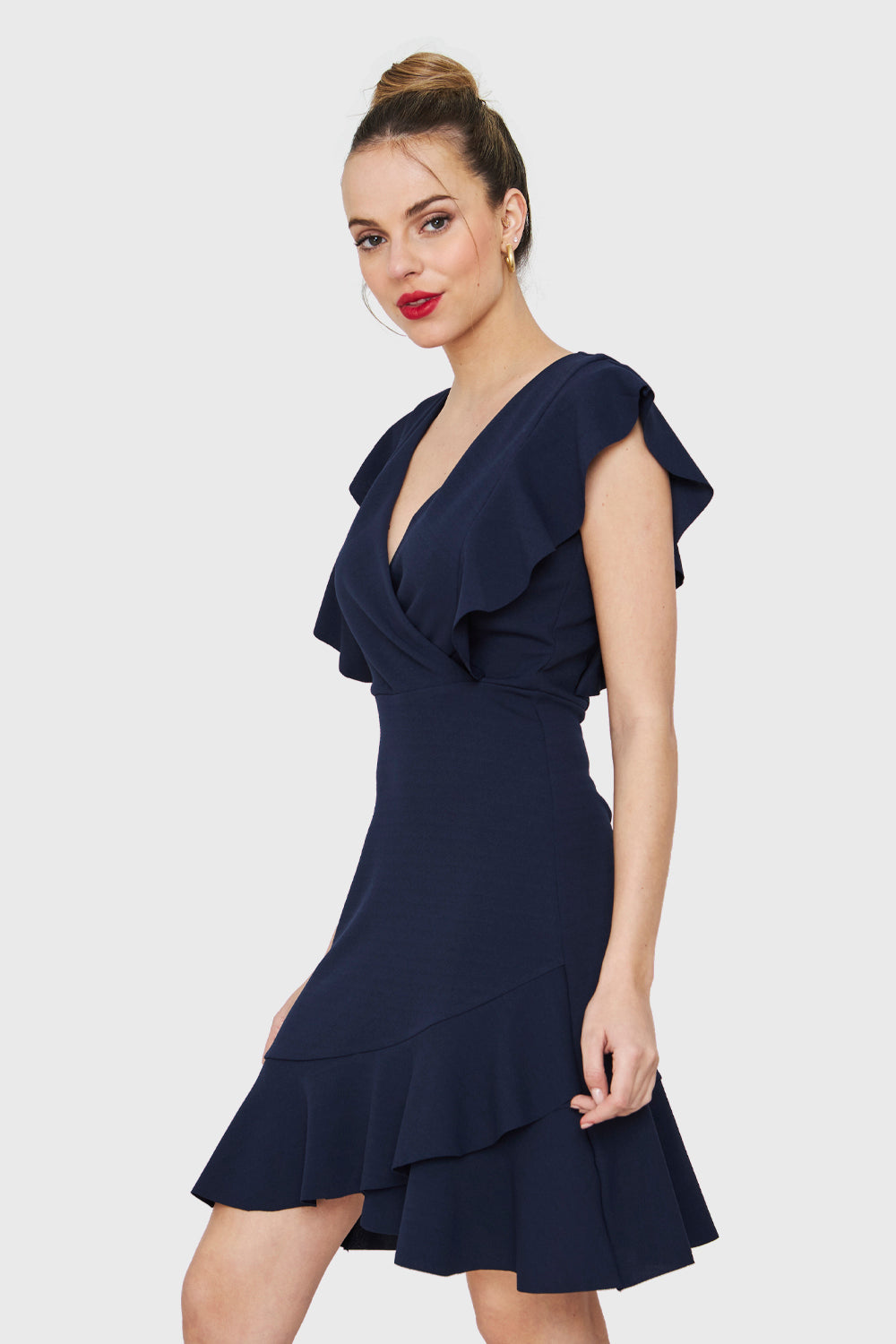Características: Vestido corto con detalle de volante en canesú. Sin manga. Escote cruzado con broche de ajuste. Cierre invisible en espalda. Volante en parte inferior del faldón. No posee forro.