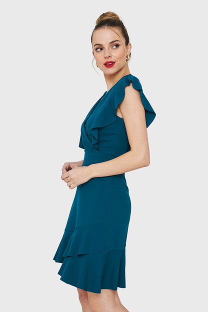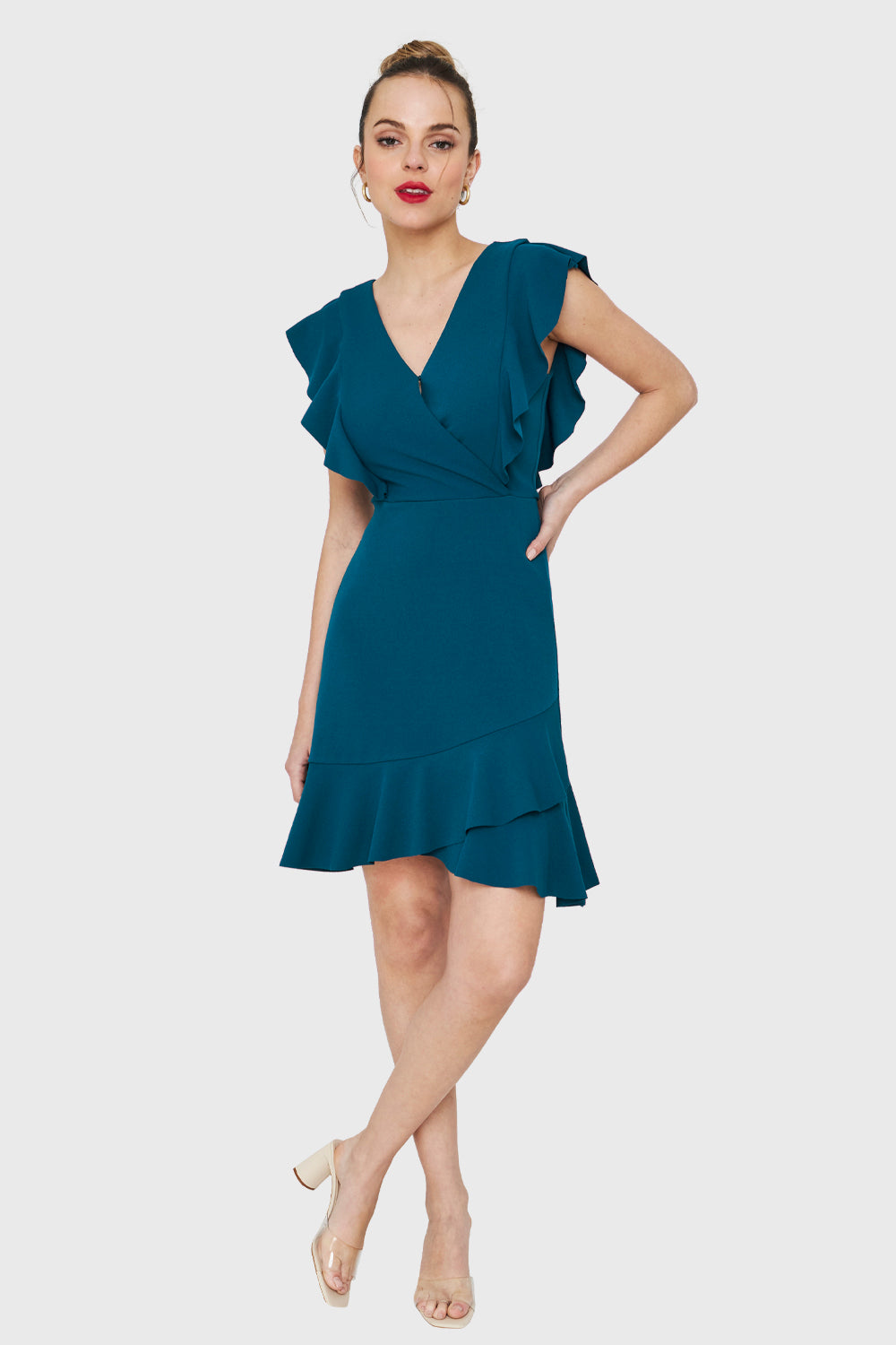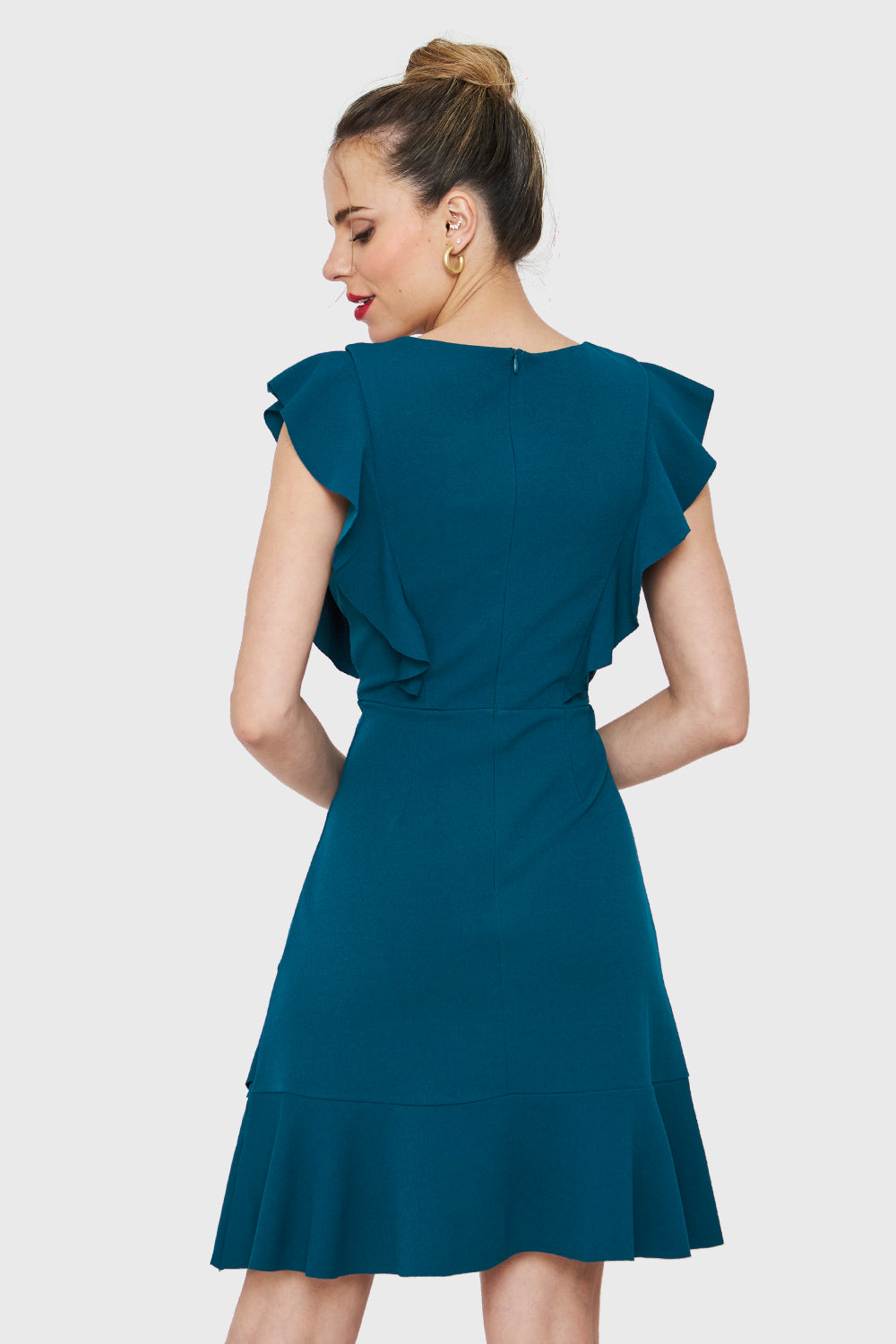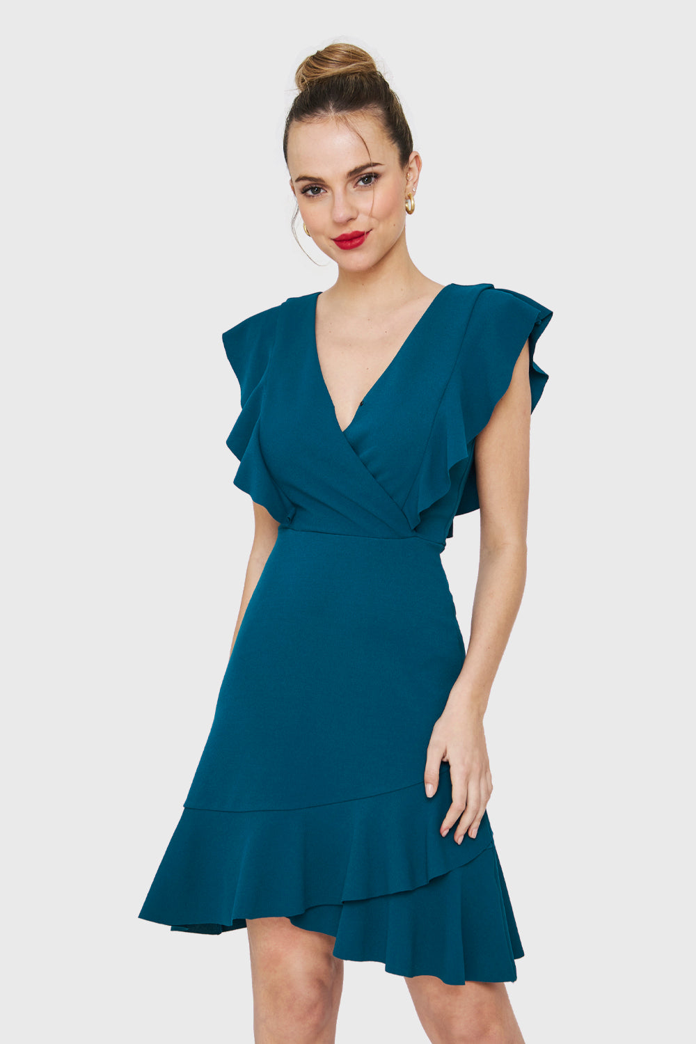 Características: Vestido corto con detalle de volante en canesú. Sin manga. Escote cruzado con broche de ajuste. Cierre invisible en espalda. Volante en parte inferior del faldón. No posee forro.