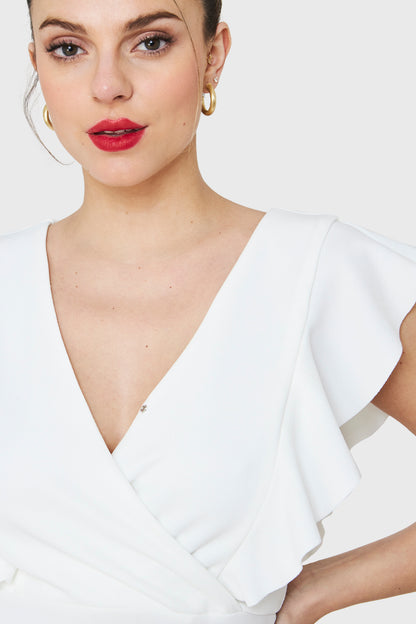 Características: Vestido corto con detalle de volante en canesú. Sin manga. Escote cruzado con broche de ajuste. Cierre invisible en espalda. Volante en parte inferior del faldón. No posee forro.